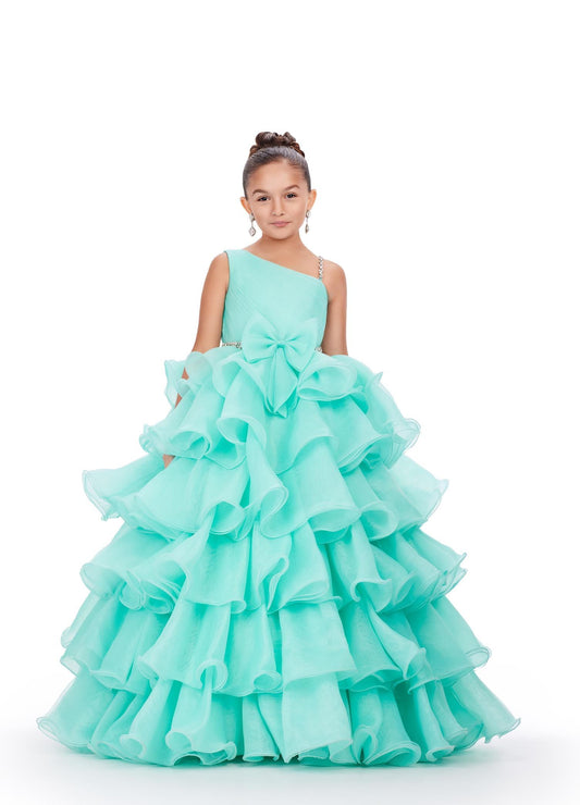 Ashley Lauren Kids 8217 Size 12 Aqua Long Ruffle Layer Girls Pageant Ballgown Bow Crystal Belt Gown