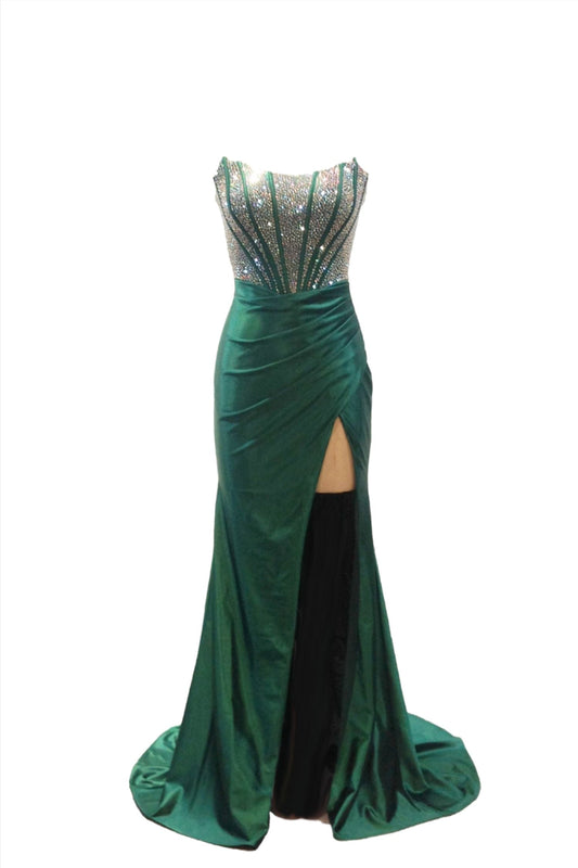 Ladivine 7492 Size 12 Emerald Long Fitted Corset Satin off the shoulder maxi slit Prom Dress Formal Gown