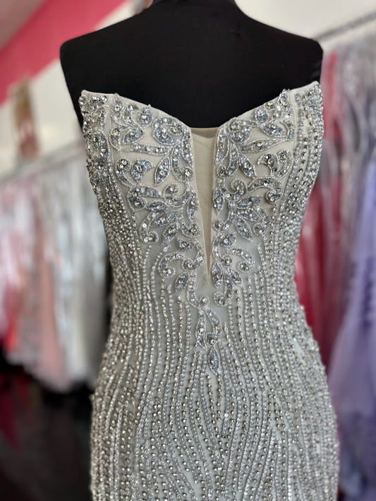 Chic and Holland HF110284 Size 0 Silver Crystal Fitted Pageant Dress High Slit Formal Couture Gown