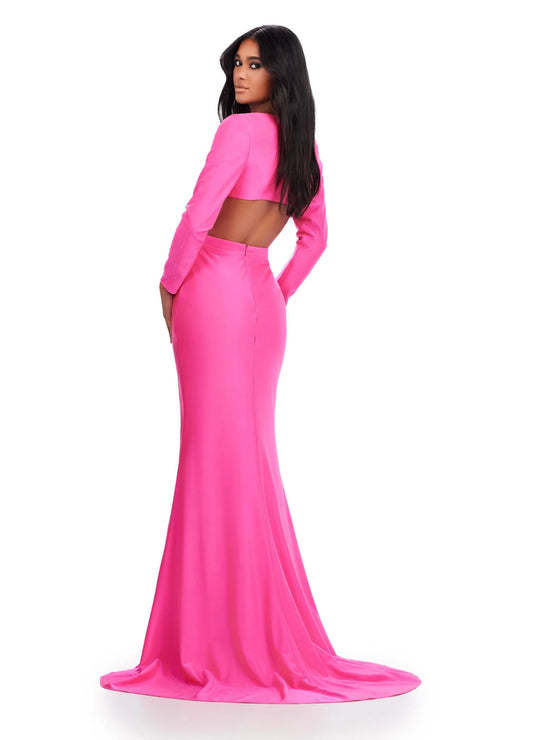 Ashley Lauren 11607 Size 0 Hot Pink Cutout Prom Dress Long Sleeve Jersey Slit Fitted Skirt Formal Gown