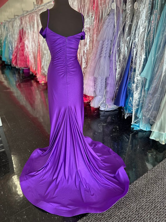 Nina Canacci 1578 Size 4 Purple Fitted Jersey off the shoulder Formal Dress Ruched Slit Train Gown