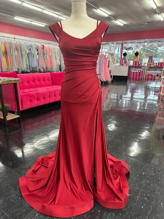Nina Canacci 1578 Size 4 Burgundy Fitted Jersey off the shoulder Formal Dress Ruched Slit Train Gown