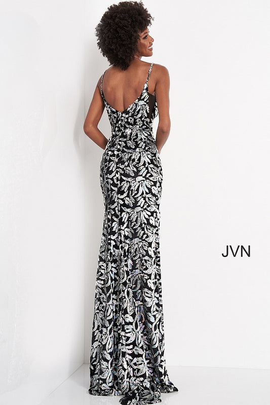 Jovani JVN04072 Size 10 Long Fitted Black Sequin Velvet Prom Dress Slit Sheer Panel V Neck