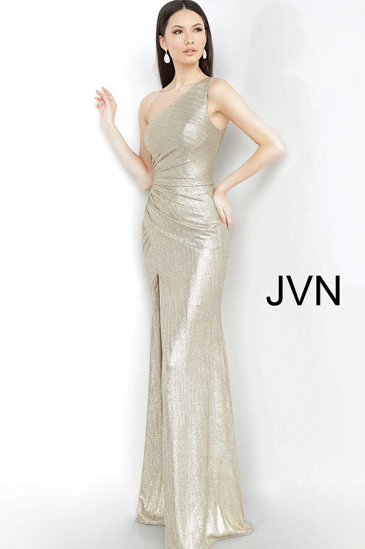 Jovani JVN4734 Size 0 Gold Shimmer Metallic Prom Dress One Shoulder Fitted Slit