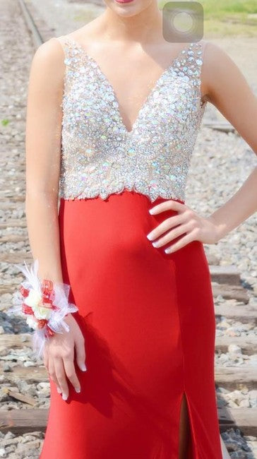 Jovani JVN86957 Size 8 Red Jersey Crystal Bodice Sheer Pageant Dress slit