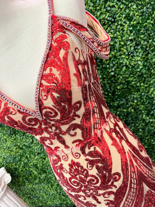Johnathan Kayne 2600 Size 4 Red Nude Long backless sequin off the shoulder slit formal Pageant Dress