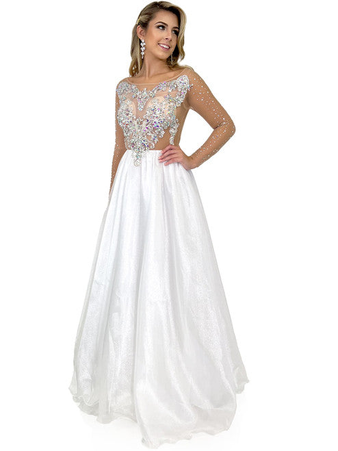Marc Defang 8309 Size 6 White Sheer Crystal Bodice A Line Pageant Dress Formal Long Sleeve Ball Gown