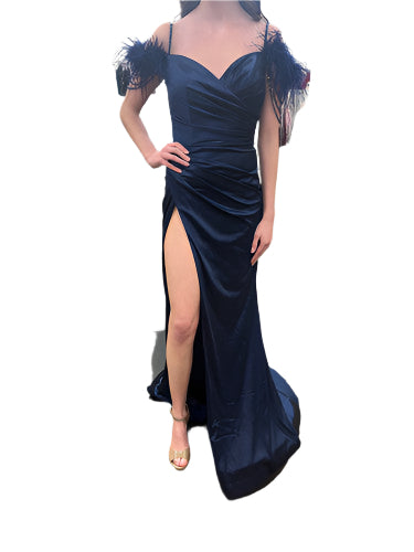 Vienna Prom 7949 Size 6 Navy Long Ruched maxi slit Feather Shoulders Prom Dress off the shoulder Gown