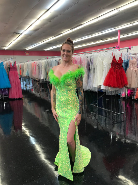 Marc Defang 8145 Size 2 Neon Green Velvet Sequin Feather off the shoulder Dress Slit Pageant