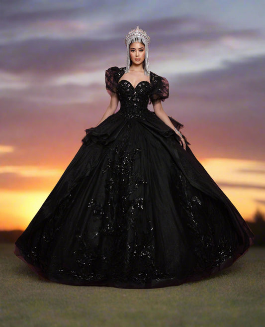 Nina Canacci Q2444 Black Quinceanera Dress 3D Floral Off the Shoulder Plunging V Neckline Glitter Tulle