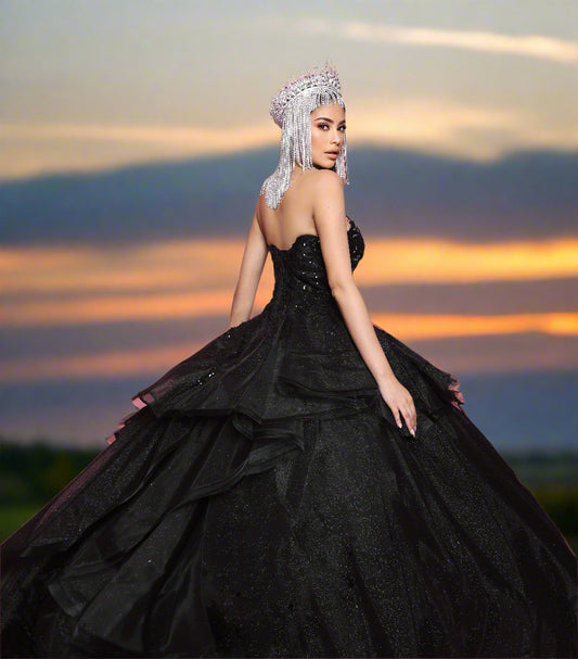 Nina Canacci Q130 Quinceneara Dress Sweetheart Neckline Glitter Lace Puff Sleeve Layered Skirt