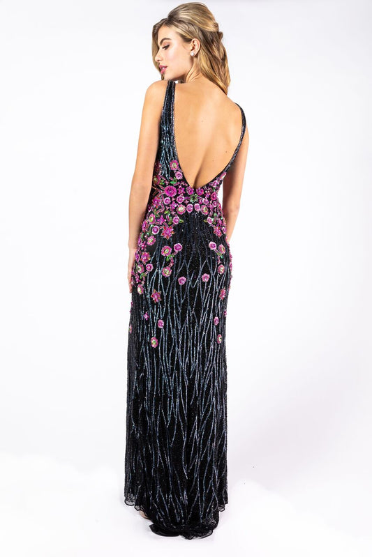 Primavera Couture 3073 Prom Dress Sequin Flowers Long Evening Gown V neckline slit