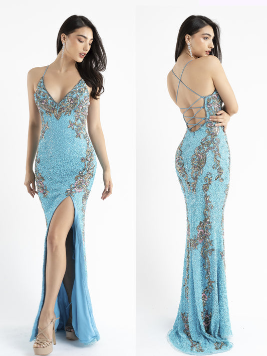 Primavera Couture 3297 Size 00 Blue v neckline sequin prom dress evening gown slit