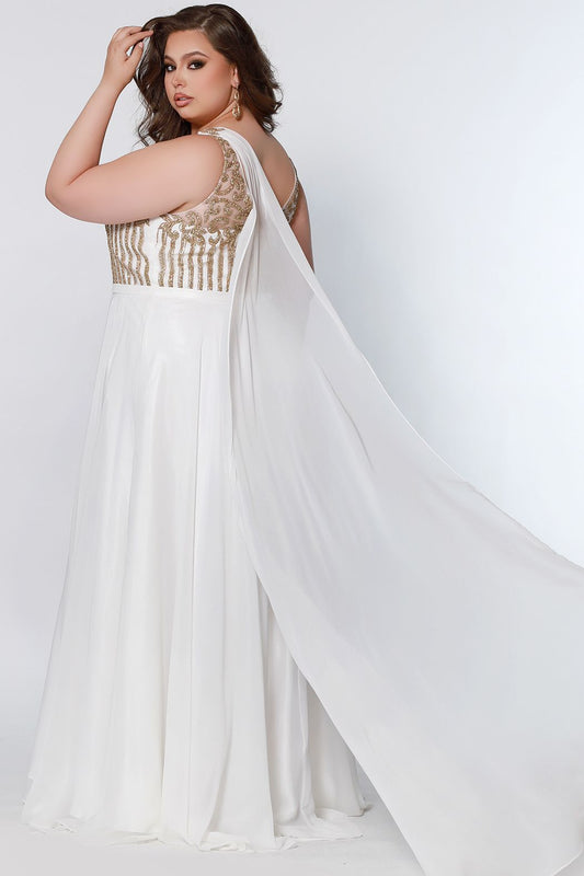 Sydney's Closet SC7331 Size 16 Ivory Gold Long Pageant Gown Cape Plus Size Prom Dress