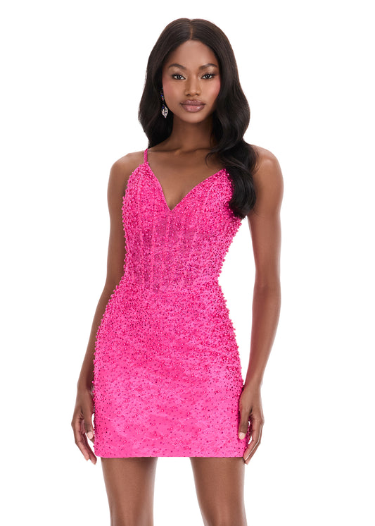 Ashley Lauren 4873 Pearl Homecoming Dress Fitted Cocktail Dress V Neck Sheer Side