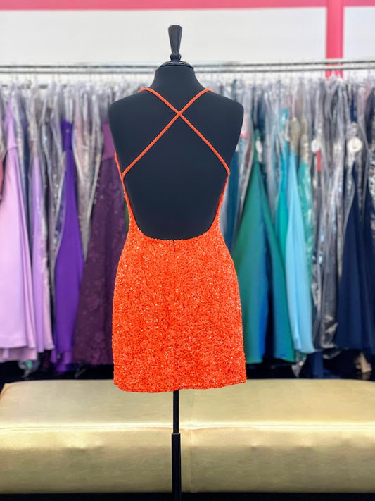 Amarra 87427 Size 10 Neon Orange Short Fitted Sequin Backless Homecoming Dress Formal Cocktail Dress