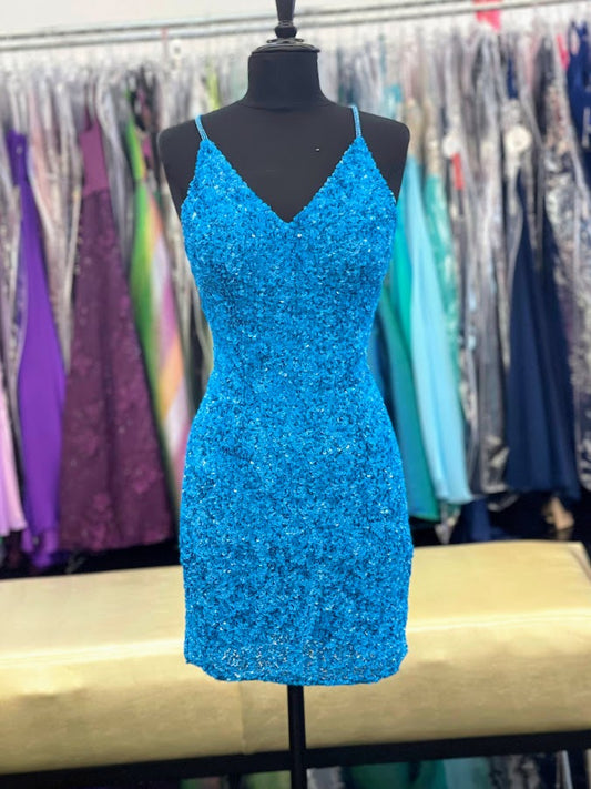 Amarra 87427 Size 4 Ocean Blue Cocktail Dress Short Fitted Sequin Backless Homecoming Dress Formal