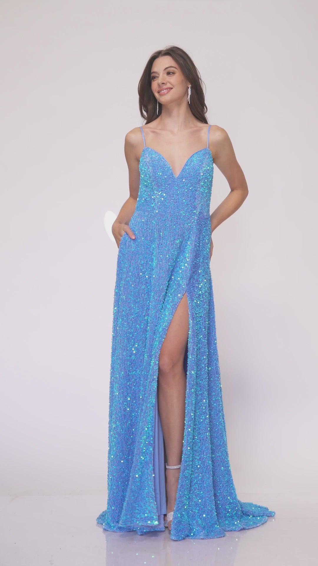 Abby Paris 90247 A Line Velvet Sequin Ballgown Prom Dress Maxi Slit V Neck Gown Pockets