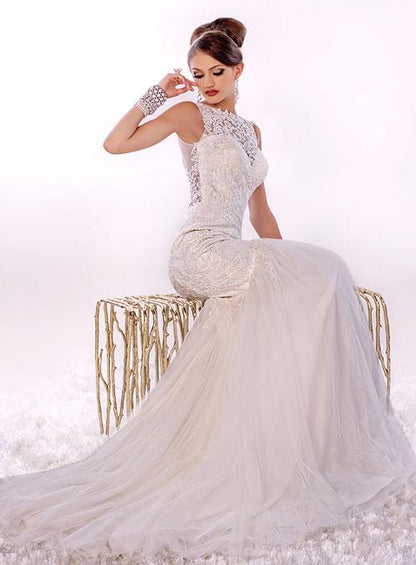 Adagio Bridal By Karishma Creations W9269 is a stunning sheer lace high neck Wedding dress. Lush lace fitted bodice with fit & Flare mermaid silhouette. sheer lace floral applique full back with button in center. Lush soft tulle subtle trumpet skirt with sweeping train.