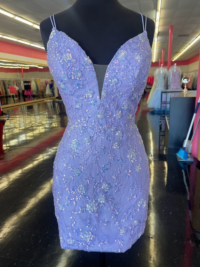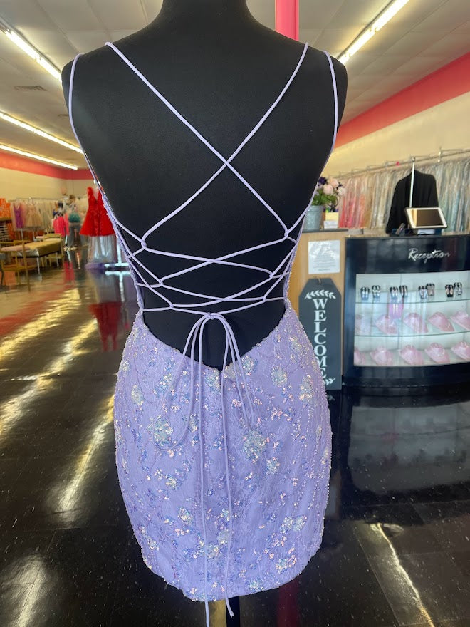 Amarra 87129 Short Fitted Lace Gown with Sequin Embellishments. This Backless Cocktail Dress Features a lace up tie Corset V neckline with mesh insert. Lilac size 8.