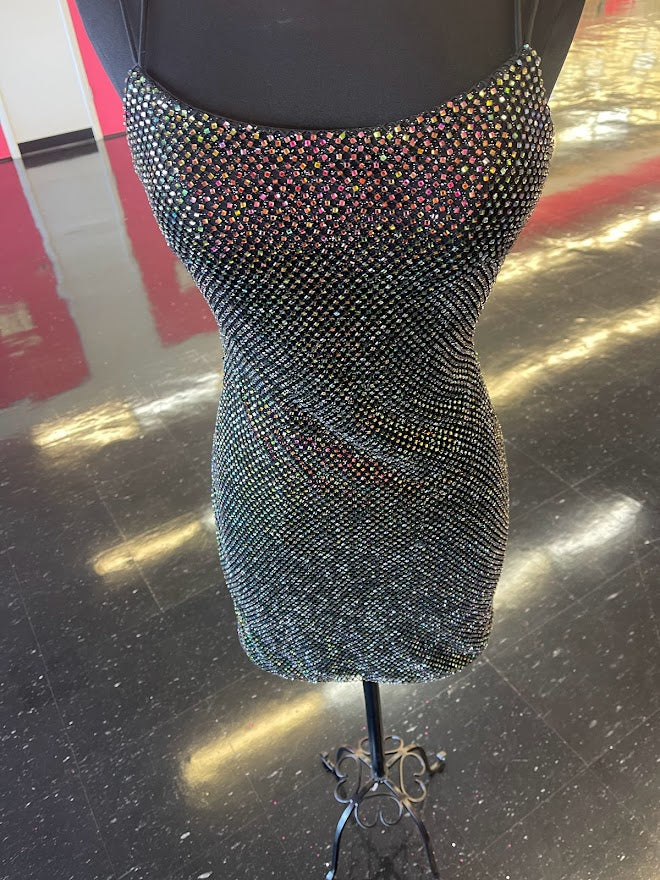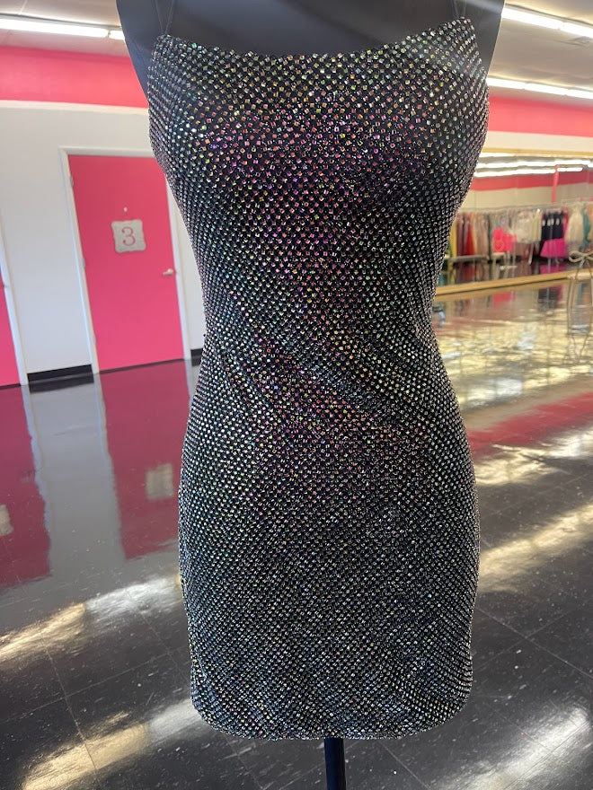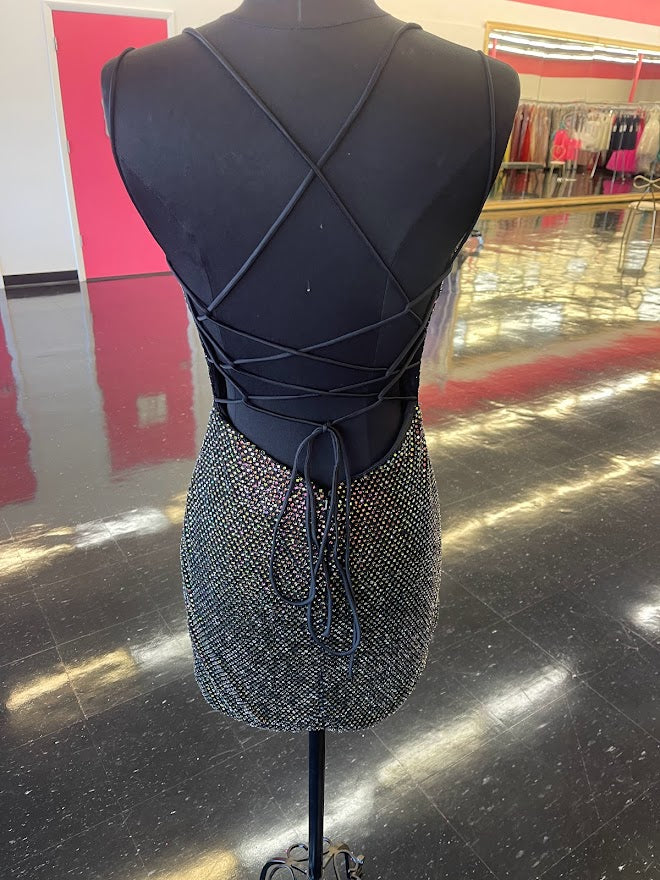 Amarra 87164 Size 4 Black/Multi Short Cocktail Dress Fitted Rhinestone Backless Corset