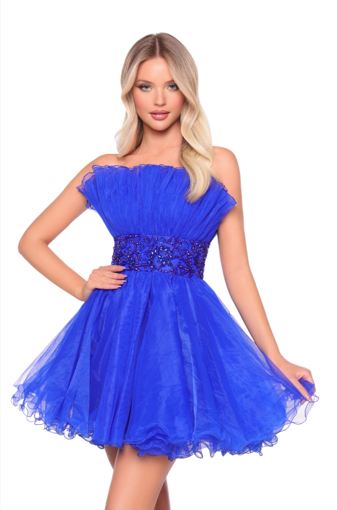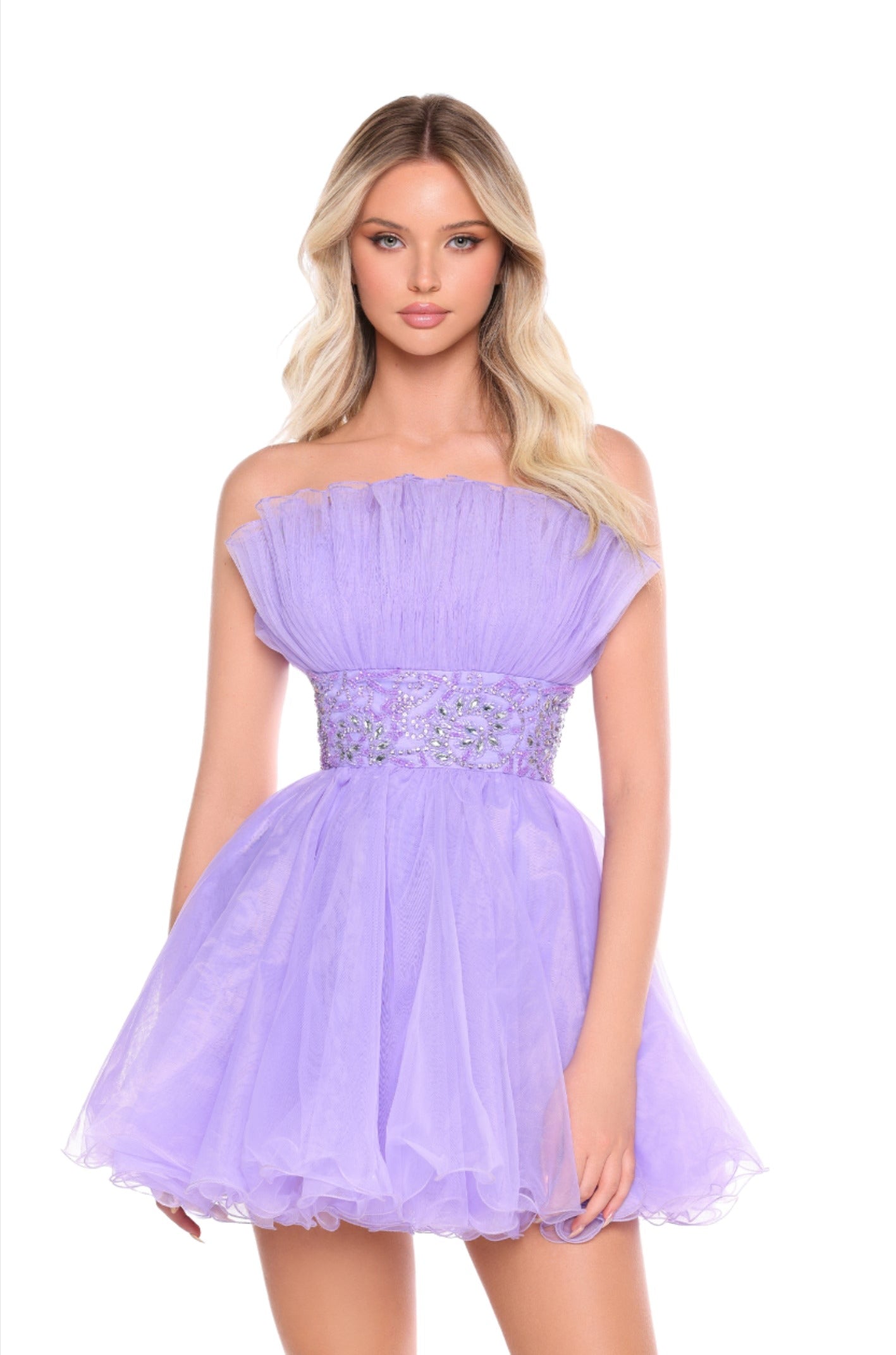 Introducing the Amarra 88038 Short Tulle A Line Homecoming Dress. This beautifully designed strapless gown features pleated tulle fabric for a sophisticated look. Perfect for any formal occasion, this dress is sure to make a statement. Expertly crafted with high-quality materials, this A-line dress will make you feel confident and elegant. This strapless tulle dress features a crinkly texture with gathered detail across the top. The neckline is straight and falls just off the shoulders, leaving the upper arms and shoulders exposed. The voluminous, fluffy skirt consists of layers of airy tulle fabric. The dress exudes a youthful, playful, and festive aesthetic, making it suitable for formal occasions or proms. This strapless tulle dress features a crinkly texture and gathered detail across the top. The neckline is straight across and falls just off the shoulders, leaving the upper arms and shoulders exposed, and it has a voluminous, fluffy skirt with layers of airy tulle fabric. The dress exudes a youthful, playful, and festive aesthetic, making it suitable for formal occasions or proms.