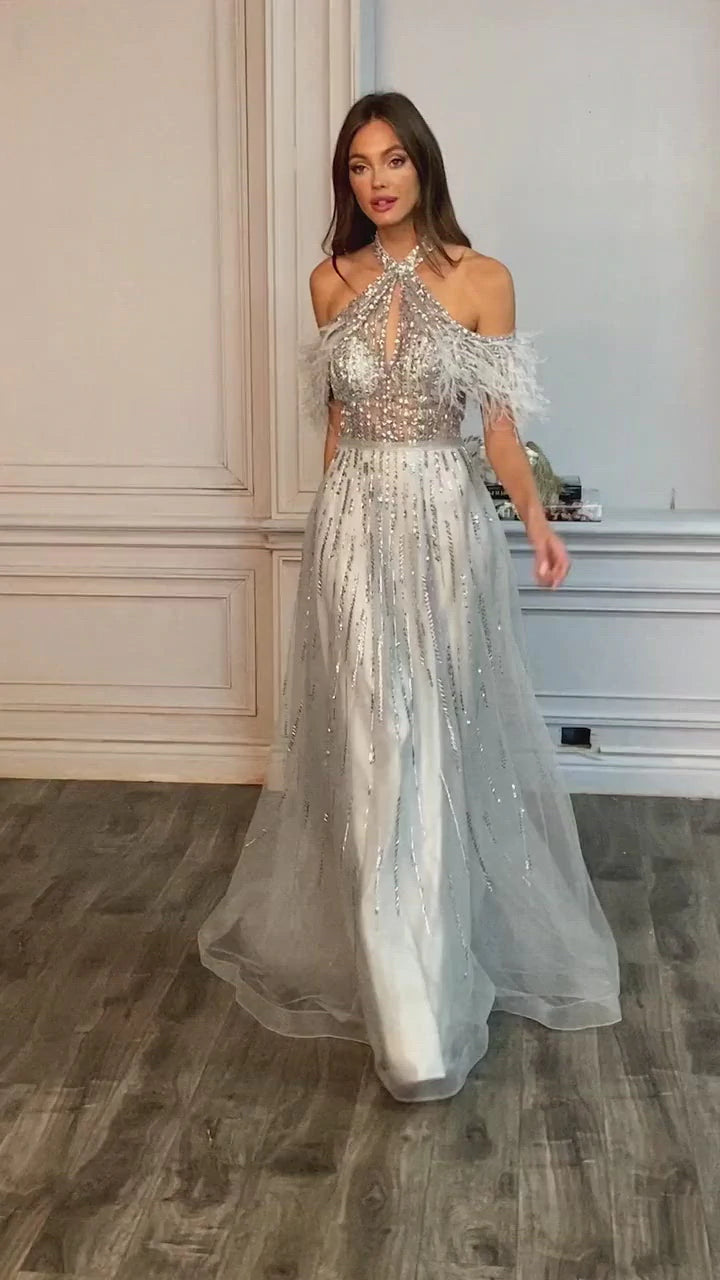 Andrea & Leo ANASTASIA A1023 Long A Line Off the Shoulder High Neck Feather Hand Beaded Formal Dress. Sheer Embellished bodice with keyhole neckline. Wedding guest dress, evening gown. Swathed in crystals and silver beads, the Anastasia Gown is a luminous beaded ball gown that you'll never forget. From the halter neck, off shoulder tulle shawl with feathers softly drapes around the shoulder. The elongating beads fall linearly from the bodice to the soft A-line skirt that softly sways as you dance the night away.