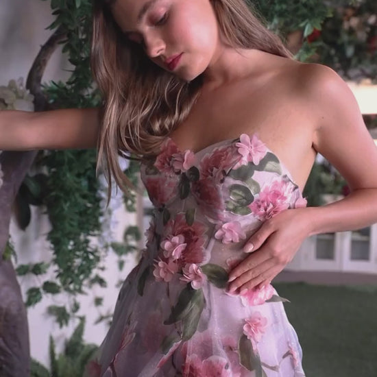 Andrea & Leo Couture A1035 Welcome to the fairytale world of magic and enchantment in this breathtaking A-line gown. This best selling gown is crafted from luxe Organza fabric, showing off an array of dimensional floral appliques and pink rose print. The strapless bodice features a sheer corset design, flaunting an ethereal blushing pink hue beneath a flourish of intricate roses and petals along the body. And if this gown couldn’t get any more romantic, it comes complete with a dramatic full-length skirt graced by an alluring leg slit for added sensual vibes. Whether you’re gliding through enchanted gardens or stealing hearts at promenade gatherings - step into fantasy with our breathless portrait of a rose gown!