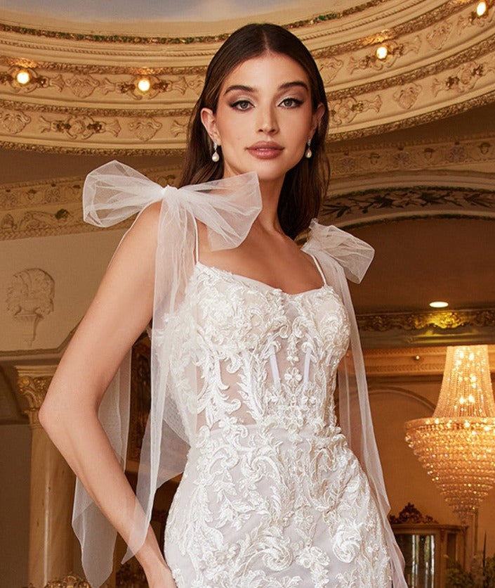 Andrea & Leo Couture BEATRICE A1086W Sheer Lace Mermaid Wedding Dress Bridal Gown Live your dream wedding in this whimsical lace mermaid corset gown. This structured sheer boned bodice has a a modern scoop neckline and thin straps with detachable tulle ribbons. The silhouette flows down to a fitted mermaid tulle train that flows with a rippling hem.