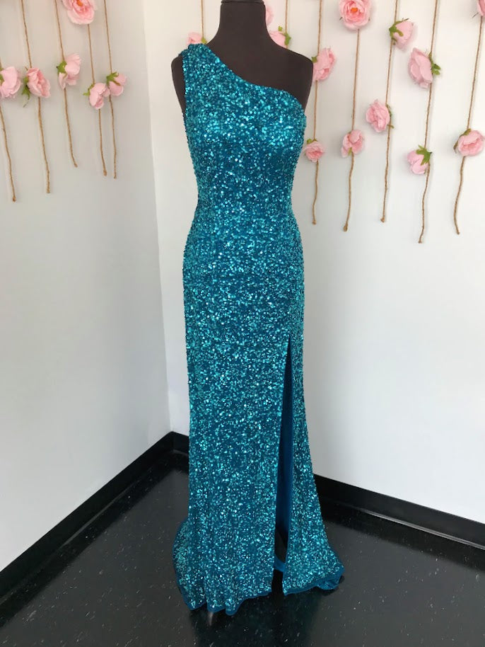 Dazzle the night away in this one shoulder sequin gown featuring an asymmetrical lace up back and left leg slit.