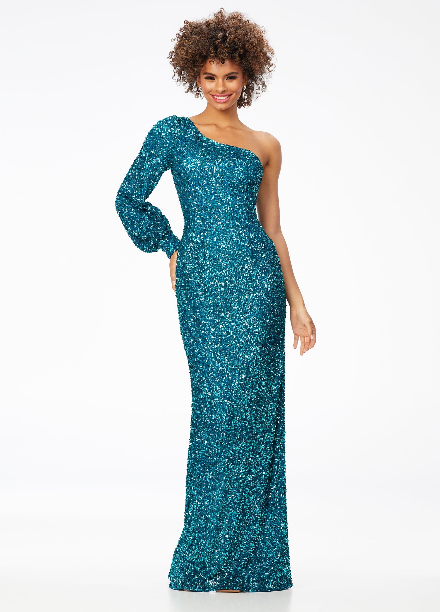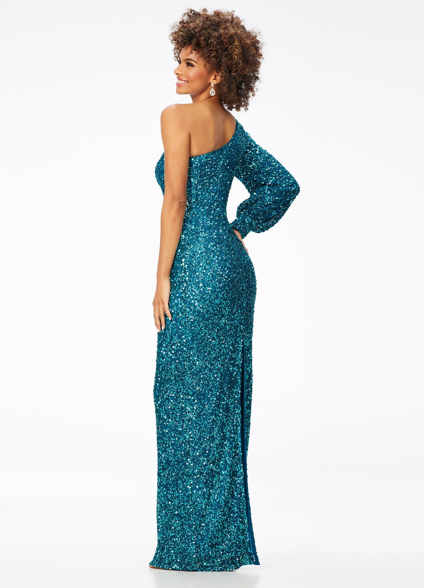 Ashley Lauren 11194 This gorgeous sequin gown features a one shoulder neckline dress features a bishop sleeve and a fitted column skirt with back vent.