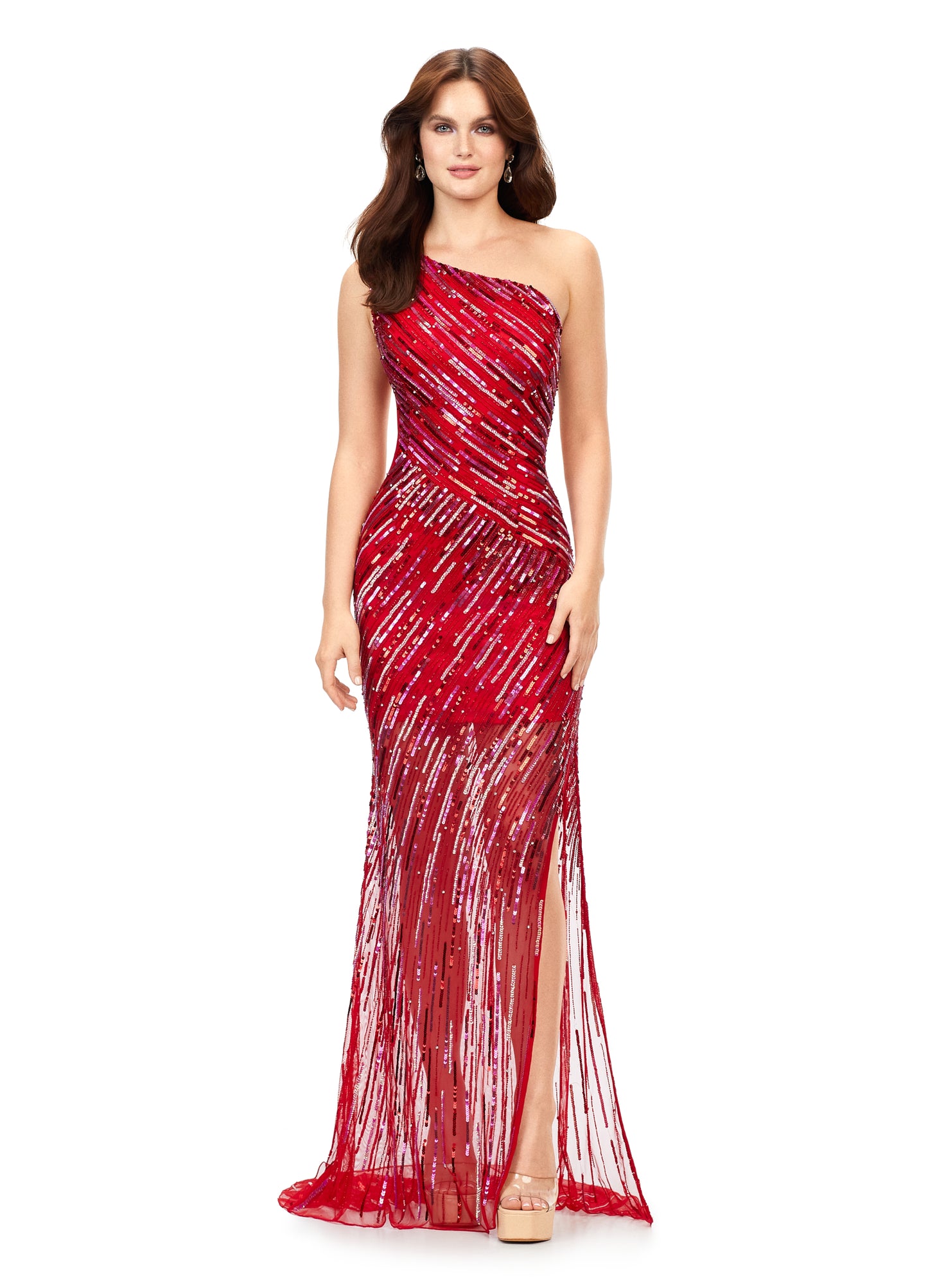 Ashley Lauren 11207 One shoulder sequin gown featuring an asymmetrical wrap sequin pattern to accentuate your waist. The dress is complete with an illusion cut out, slit and sweep train.
