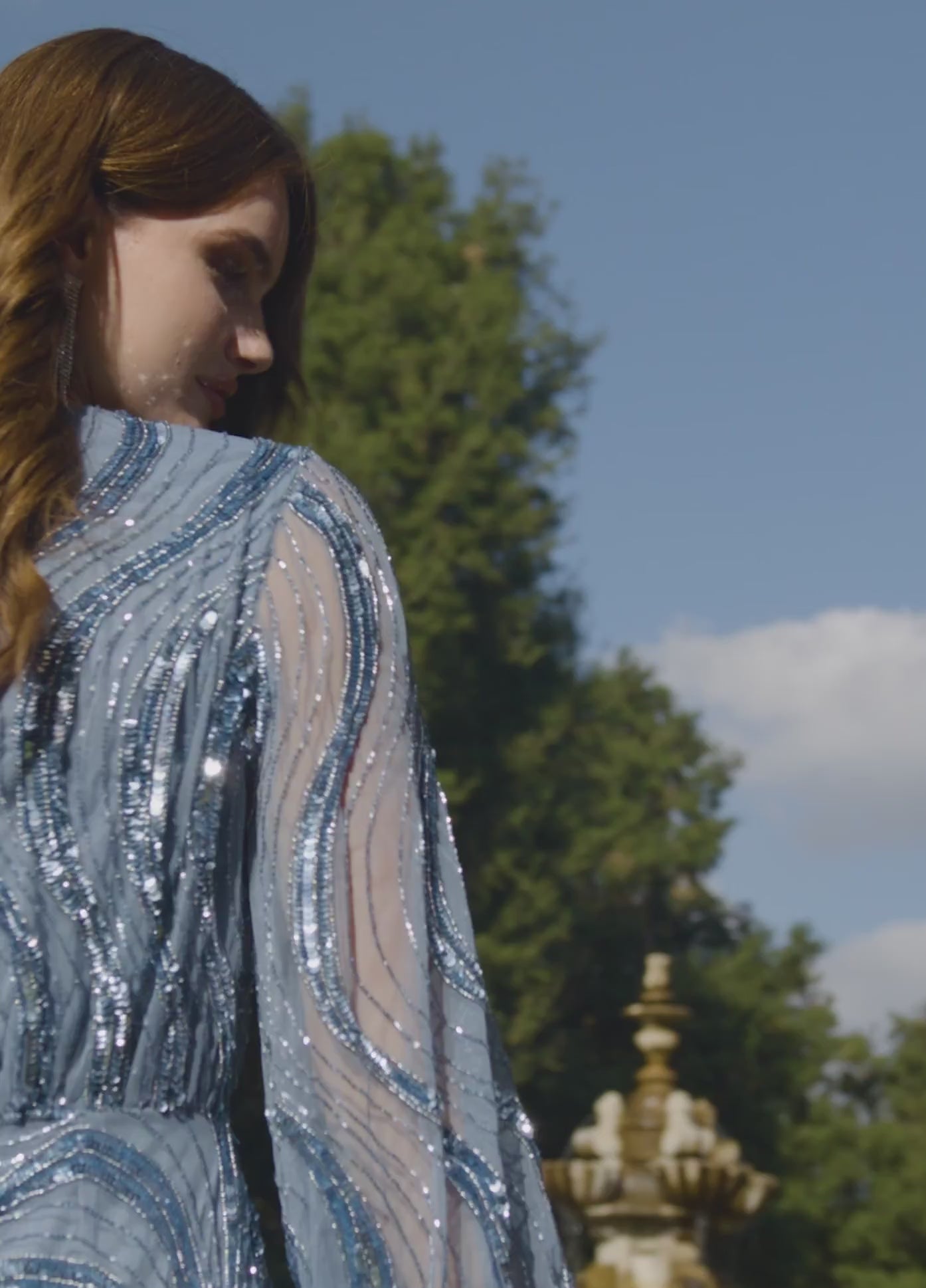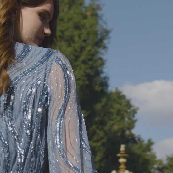 Ashley Lauren 11210 V-Neck Ballgown Sleeves High Back Fully Hand Beaded Even Gown. This stunning beaded gown has balloon sleeves and a v-neckline. It's bead motif flows throughout the entire gown creating a modern feel.