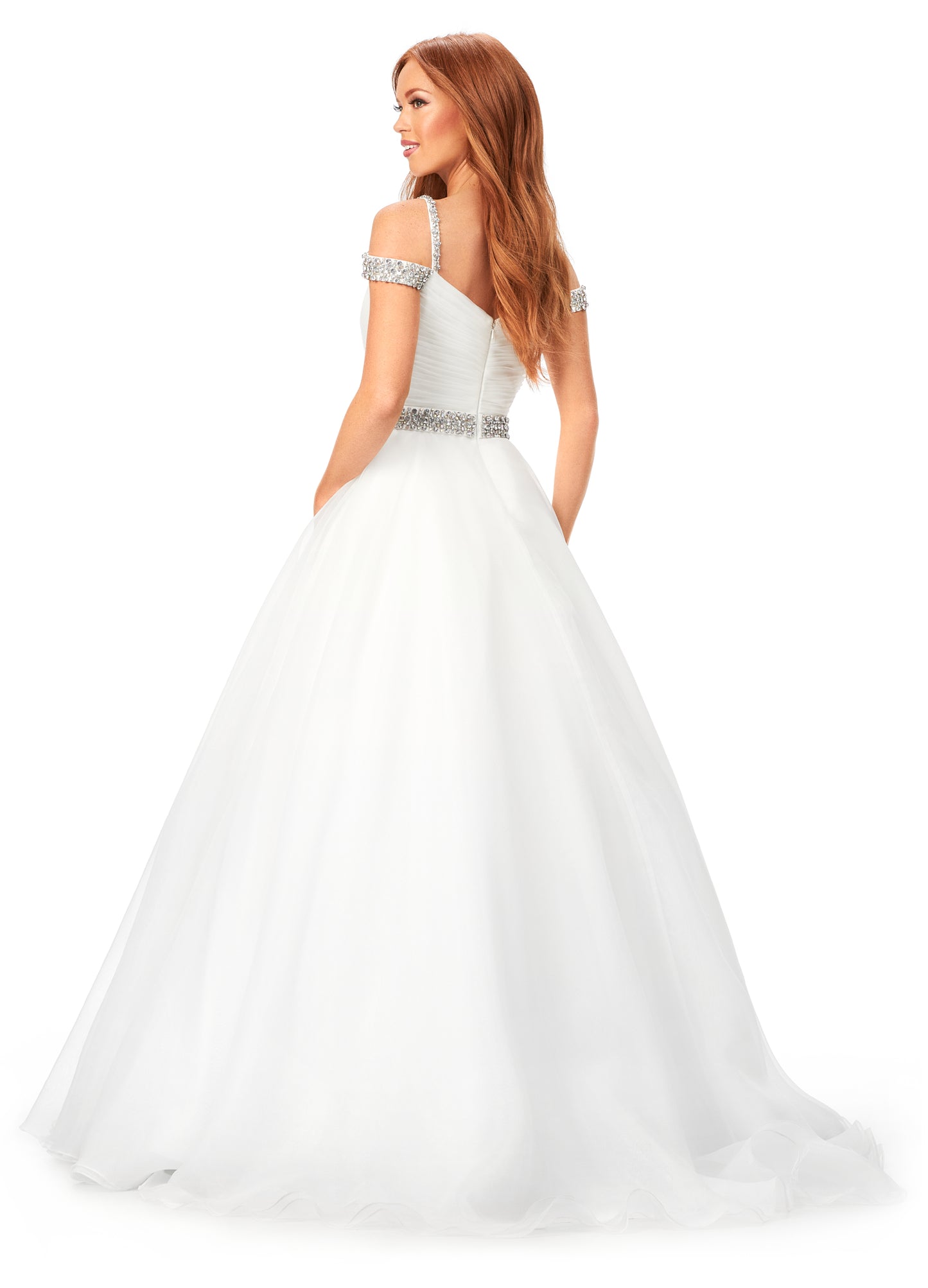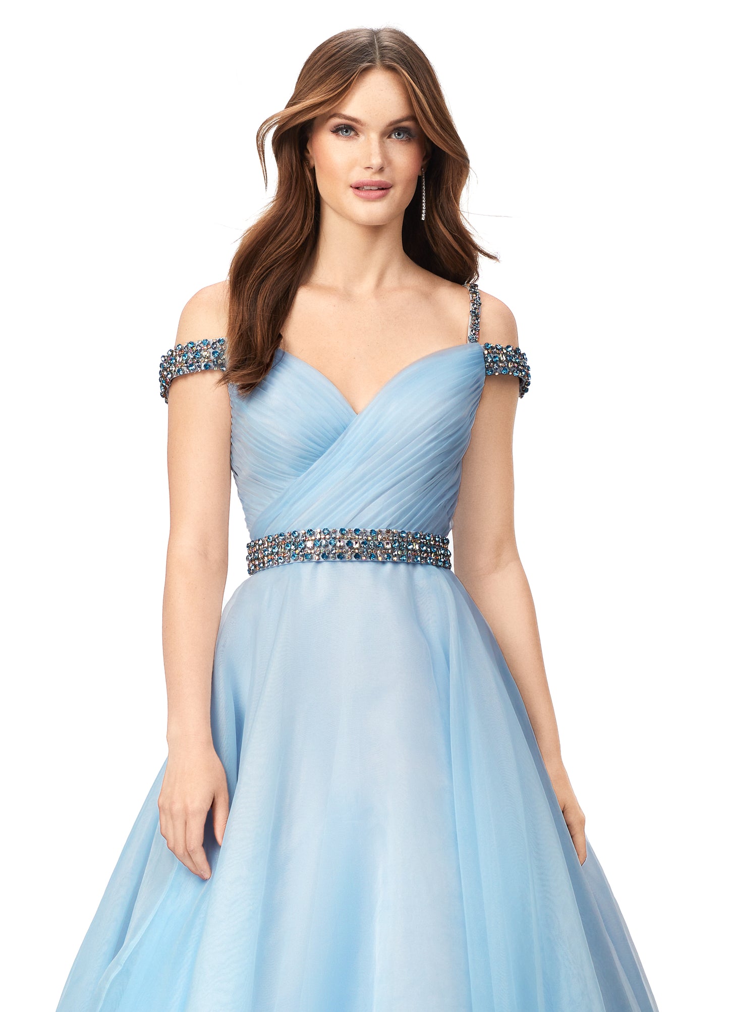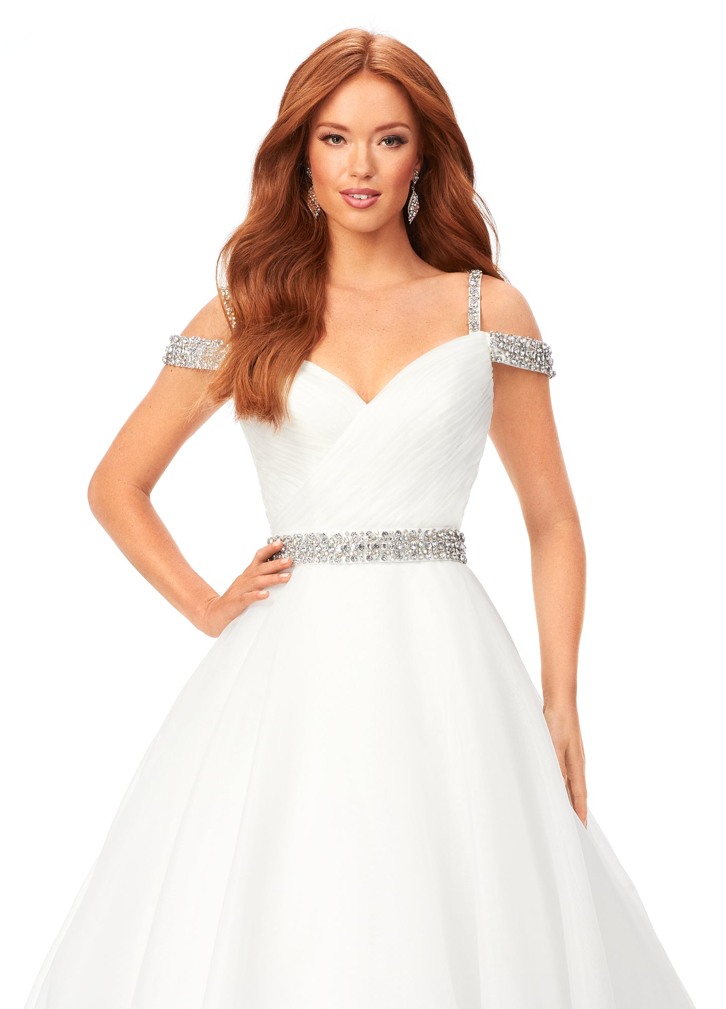 Ashley Lauren 11221 Dazzle in this off shoulder organza prom, pageant and formal evening ball gown. The wrap bustier on this dress is complete with ruching and the spaghetti straps, off shoulder straps and belt are encrusted with rhinestones.