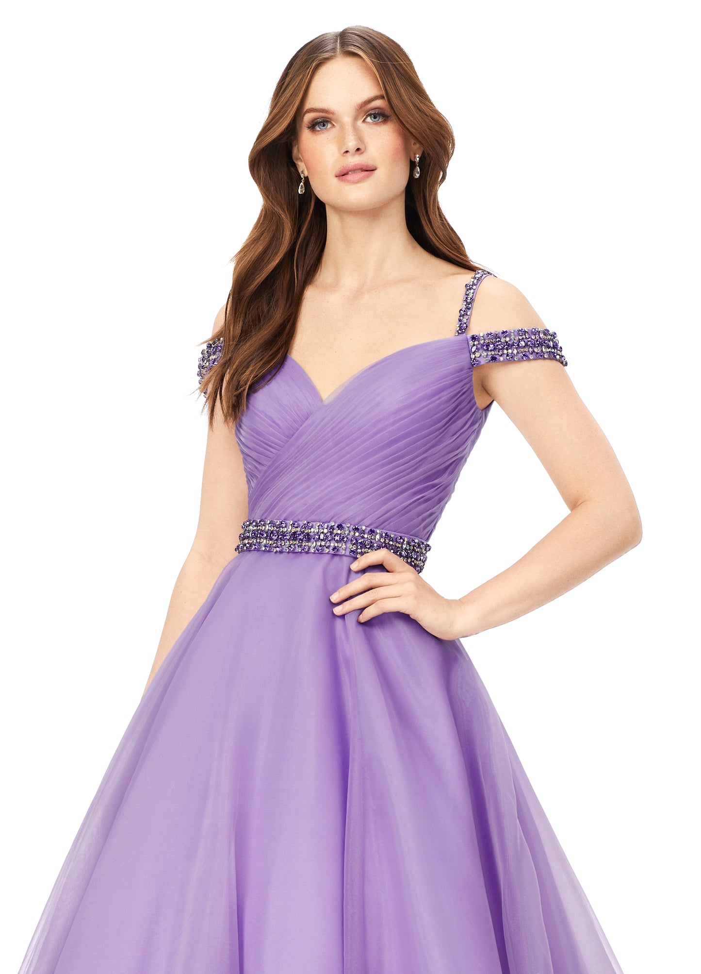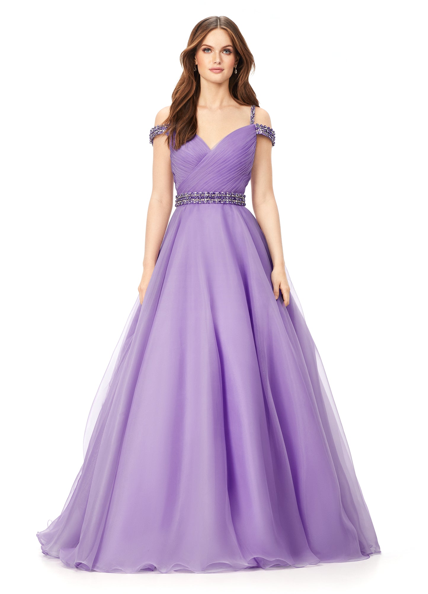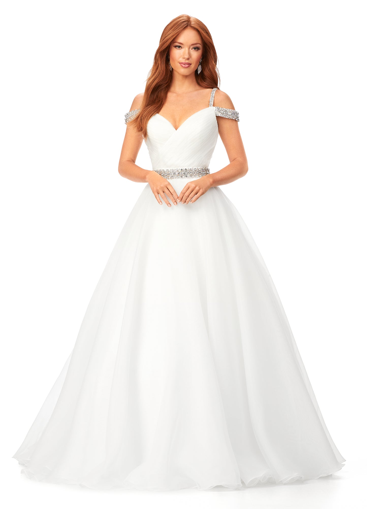 Ashley Lauren 11221 Dazzle in this off shoulder organza prom, pageant and formal evening ball gown. The wrap bustier on this dress is complete with ruching and the spaghetti straps, off shoulder straps and belt are encrusted with rhinestones.