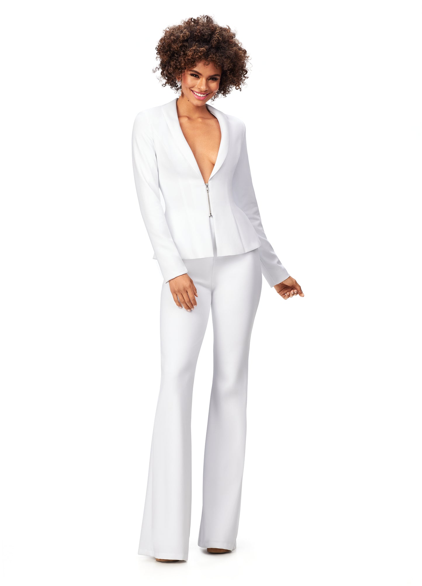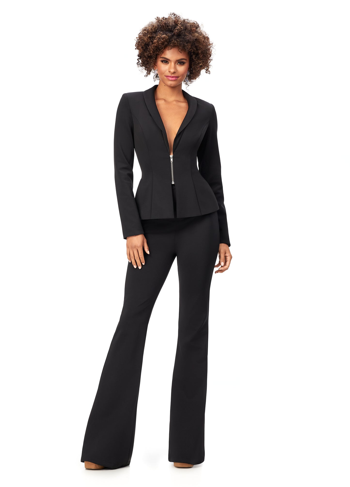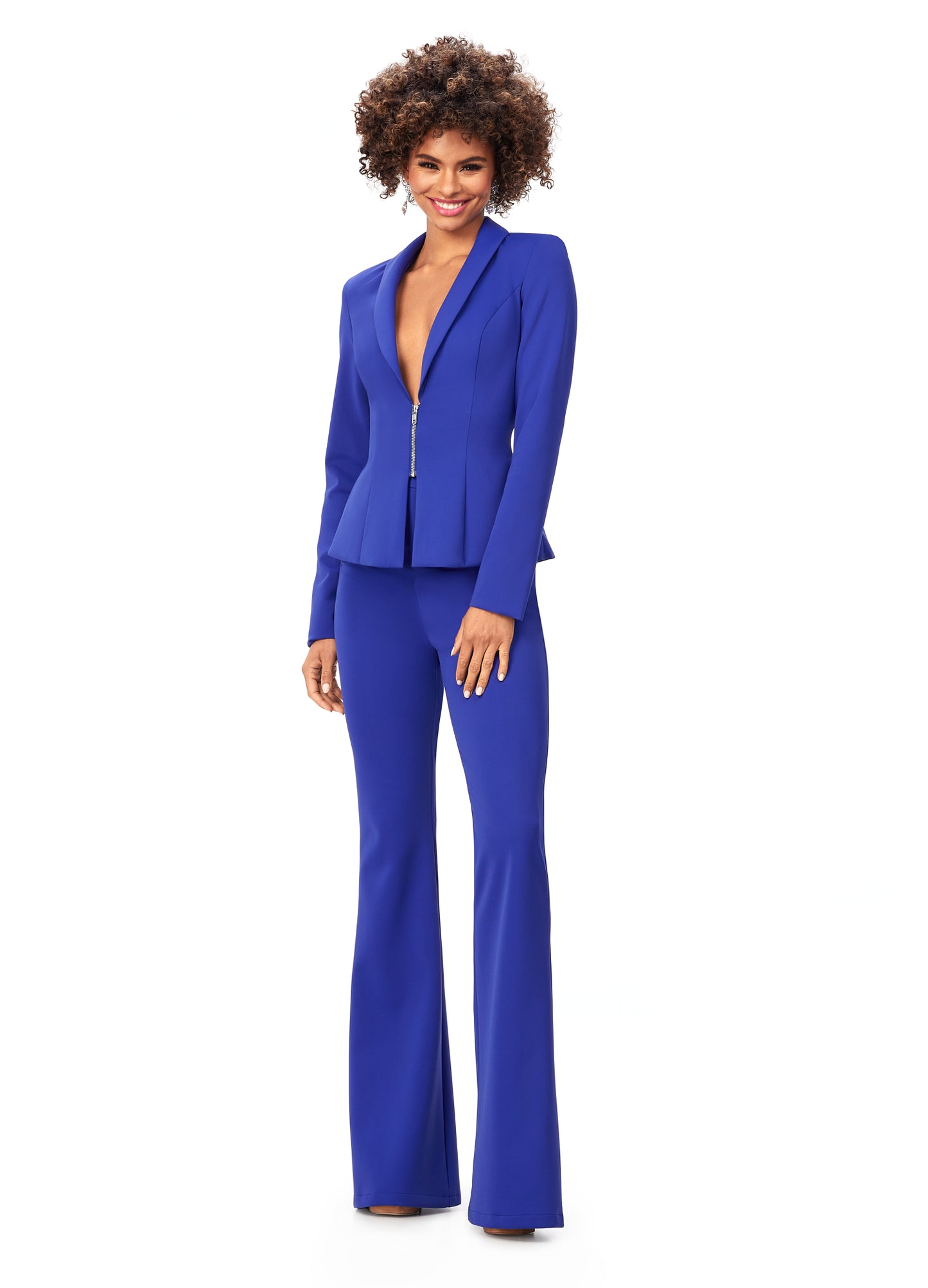 Ashley Lauren 11225 This powerful scuba pantsuit features a blazer with an exposed metal zipper. The flare pants complete the look.