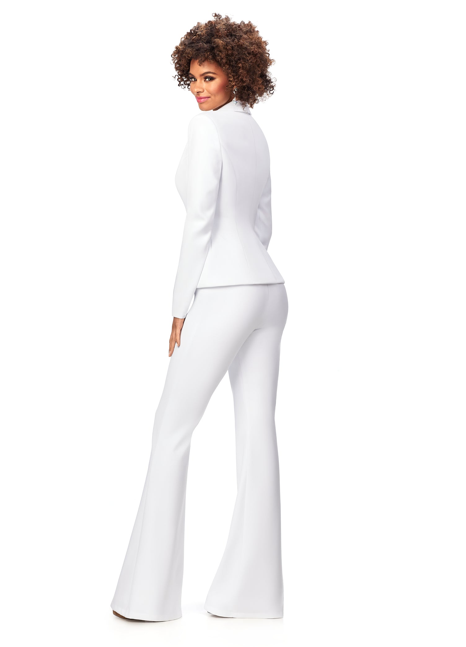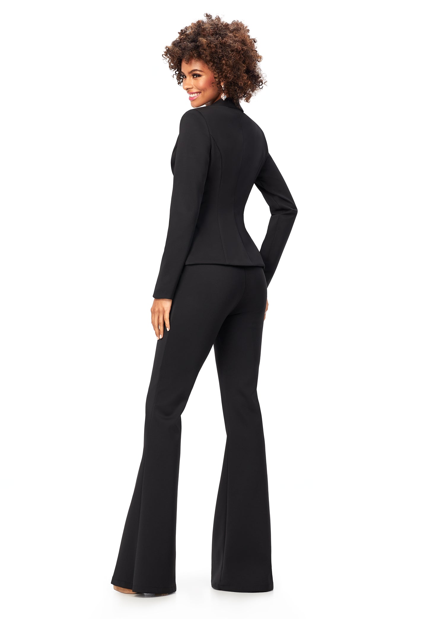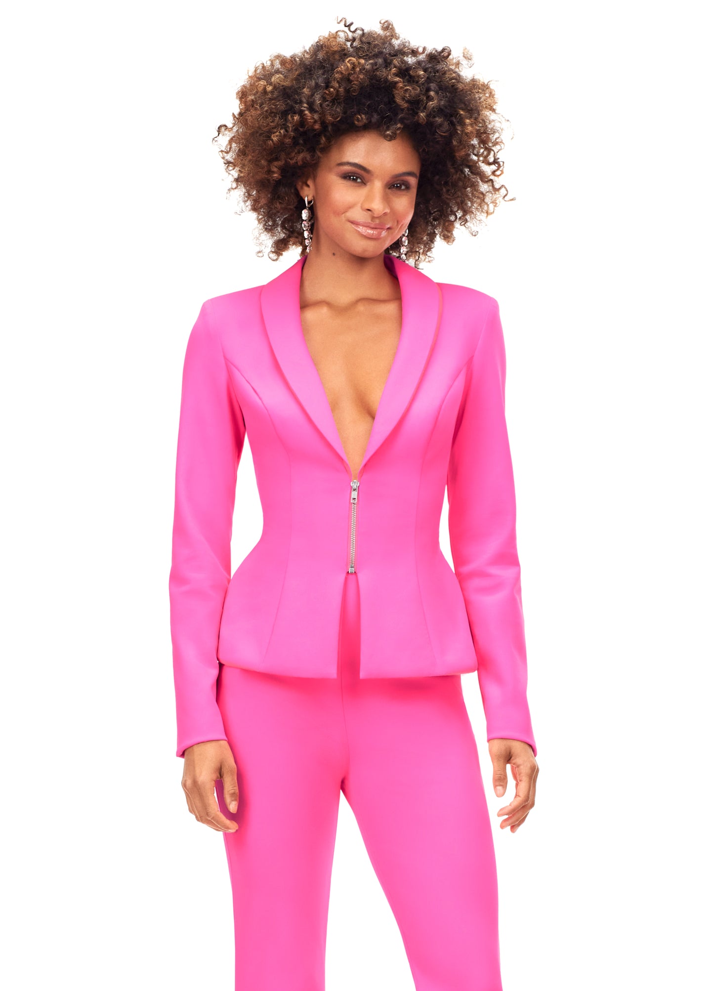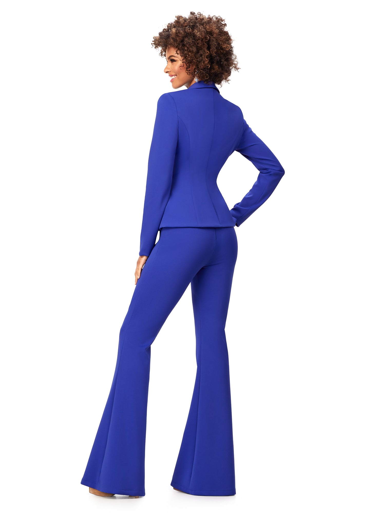 Ashley Lauren 11225 This powerful scuba pantsuit features a blazer with an exposed metal zipper. The flare pants complete the look.