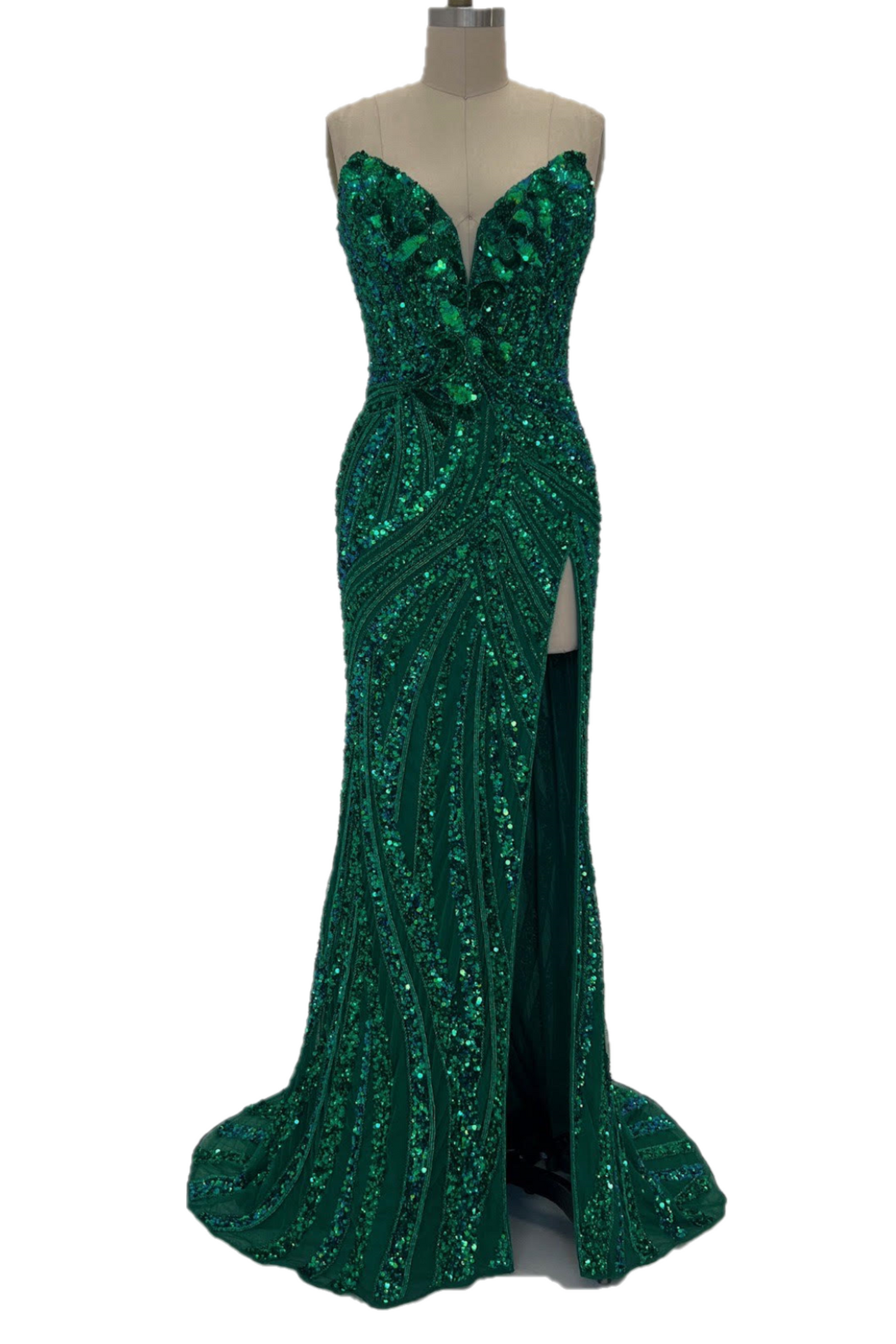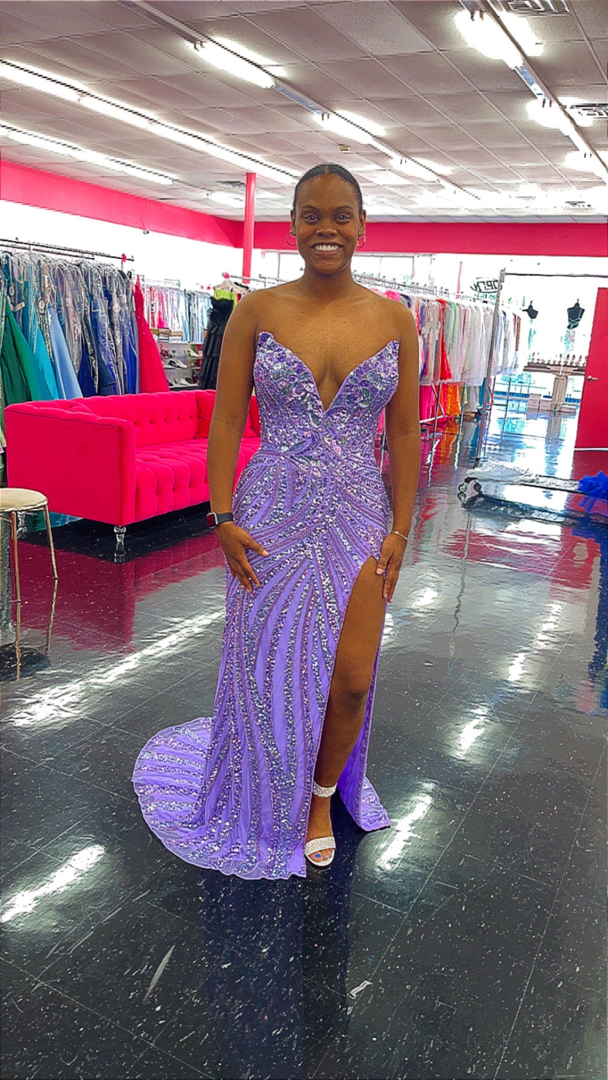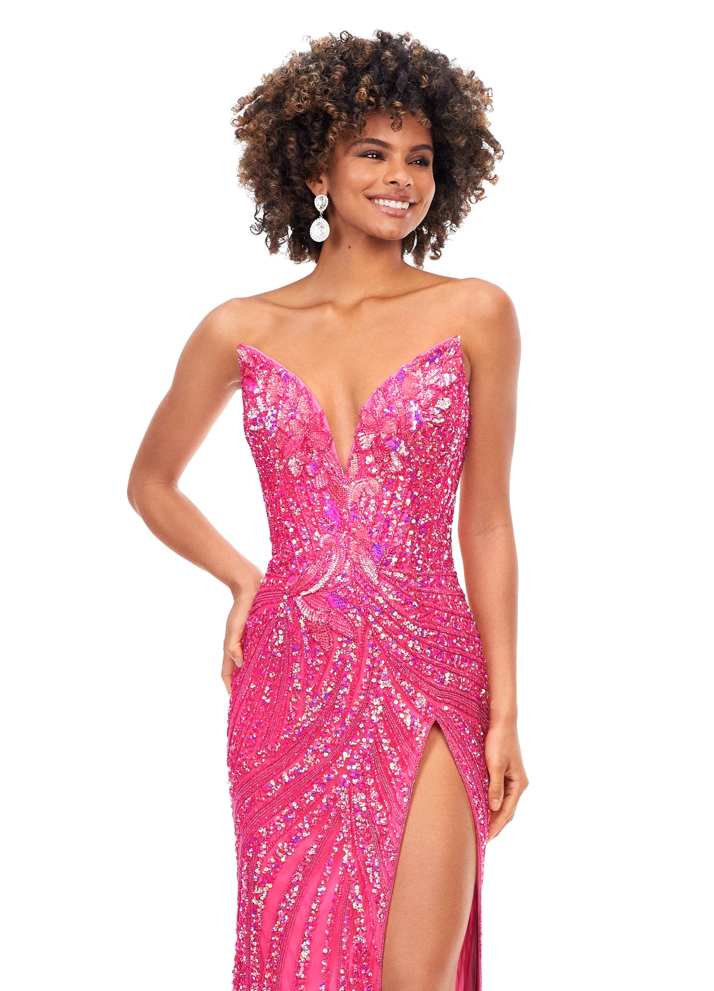 Ashley Lauren 11236 in our custom color Black and Silver is a Long Fitted V Neck Beaded Sequin Prom Dress and Evening Pageant Gown. This strapless gown is sure to turn heads. The sweetheart neckline is complete with a modern floral sequin motif that continues down the bustier and skirt. The skirt is complete with a left leg slit.