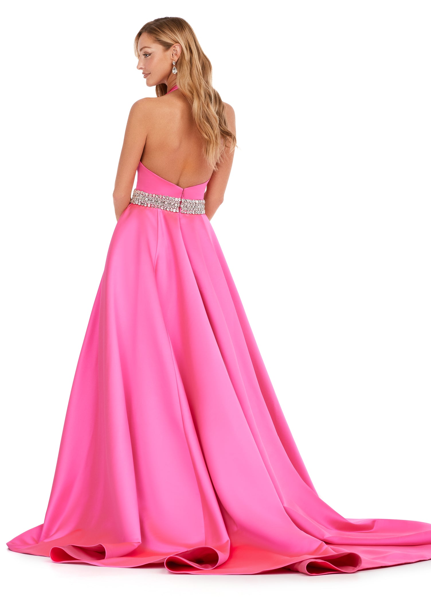 Ashley Lauren 11249 V-Neck Heavy Satin Ballgown Halter Top Open Back Crystal Belt Formal Gown Prom