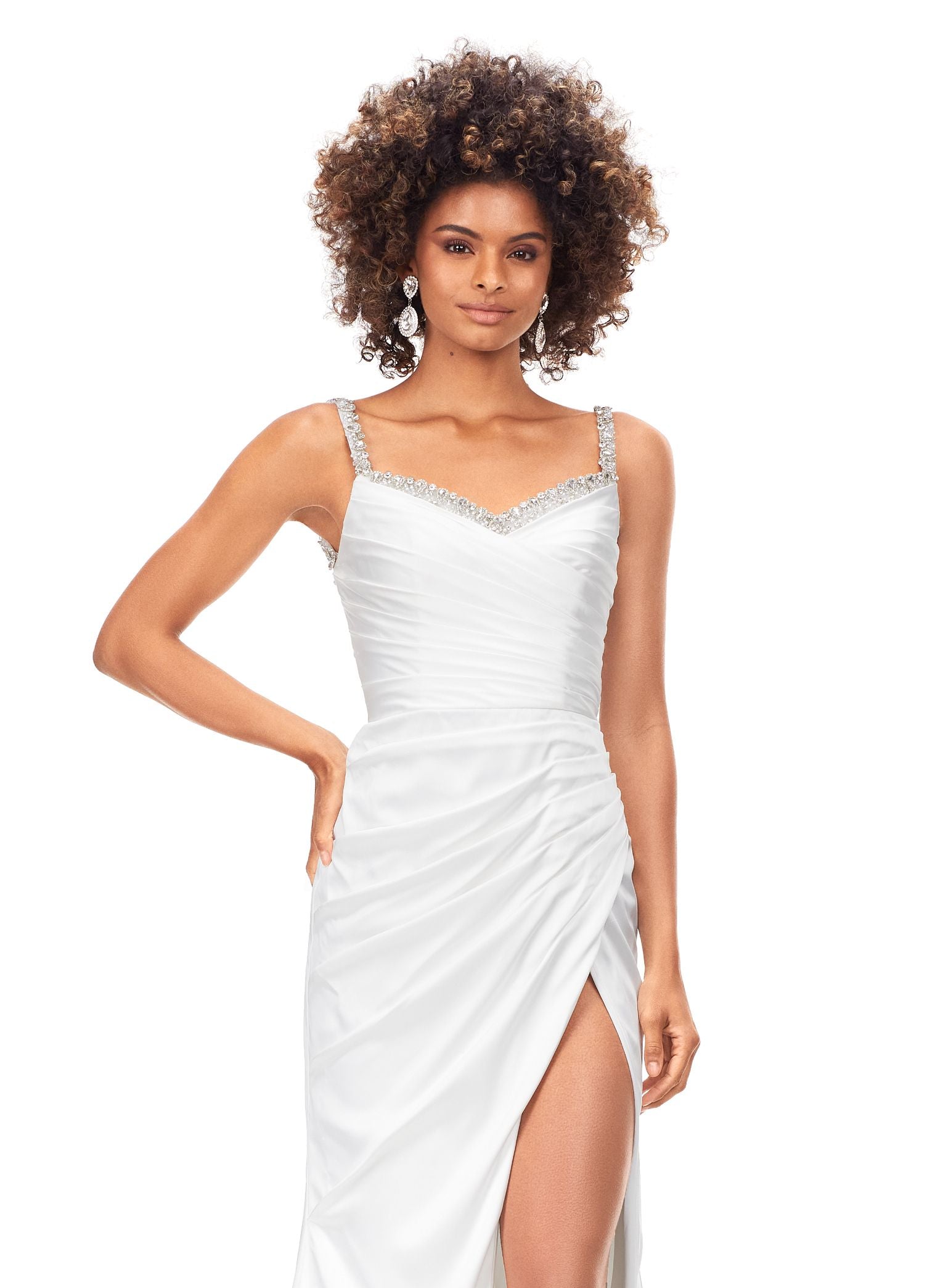 Ashley Lauren 11298 This elegant satin gown features a modified sweetheart neckline trimmed in crystals details. The ruched bodice and skirt are sure to accenuate your curves. The left leg slit and lace up back complete the look.