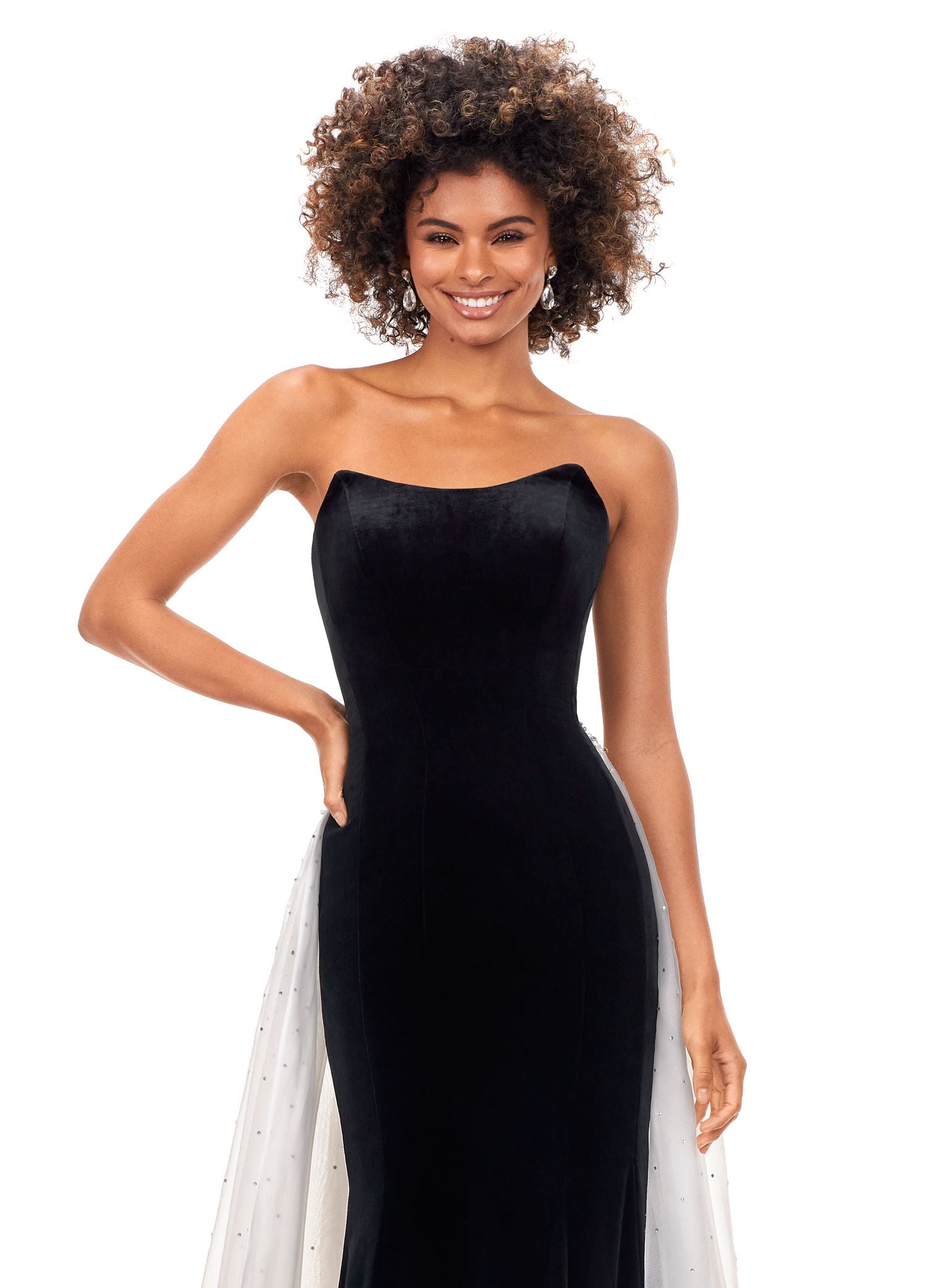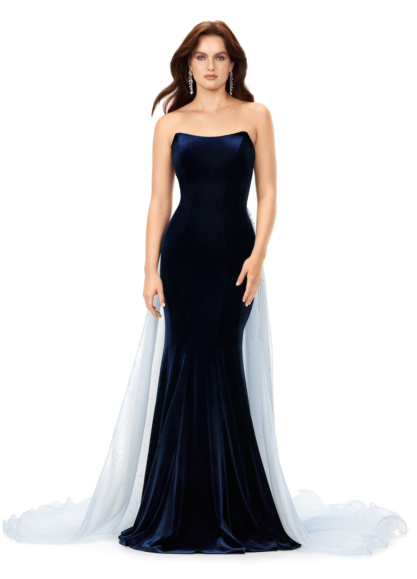 Ashley Lauren 11311 This stunning velvet gown features a sweetheart neckline with an organza overskirt. The overskirt is embellished with scattered crystals that cascade down the skirt.