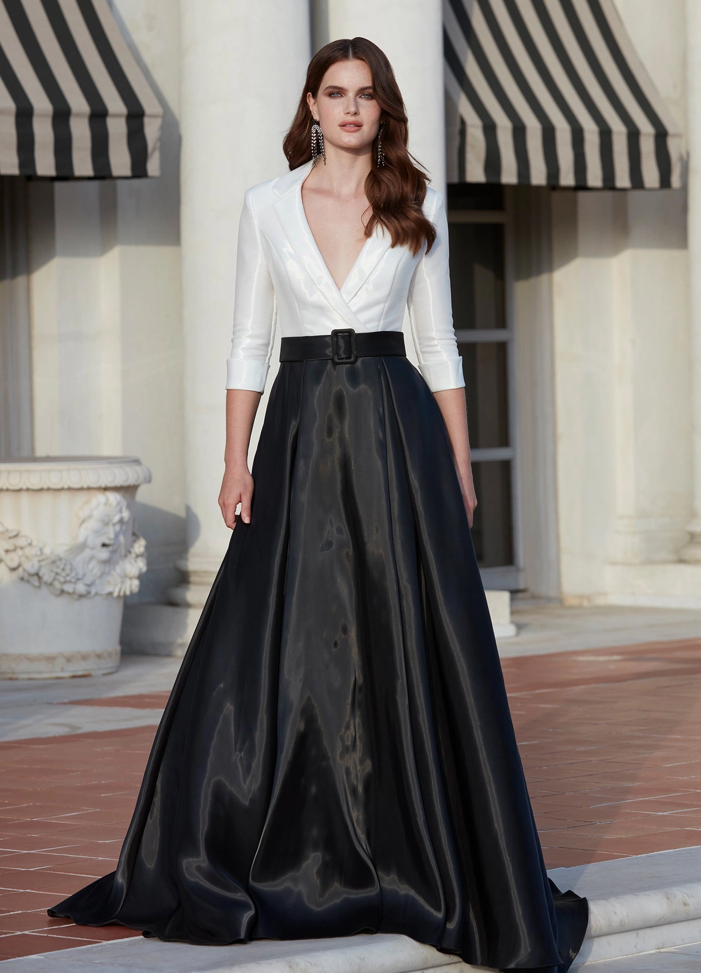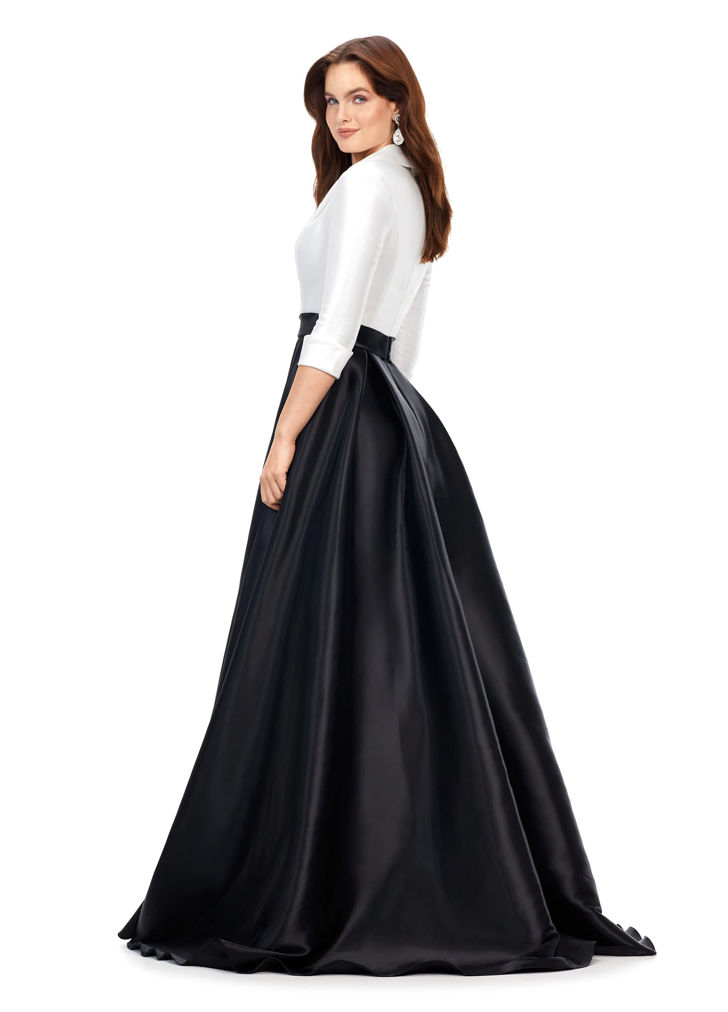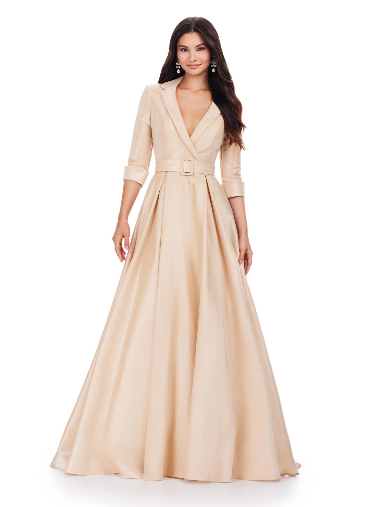 Ashley Lauren 11326 Satin Ballgown With Lapel V-Neck Gown. This stunning satin ball gown features a v-neckline. The bustier is complete with a wrap lapel that gives way to a buckled belt. *pssst...it also has pockets! Ashley Lauren 11326 Satin Ballgown Long Sleeve Formal Dress Holiday Party Mother of Gown