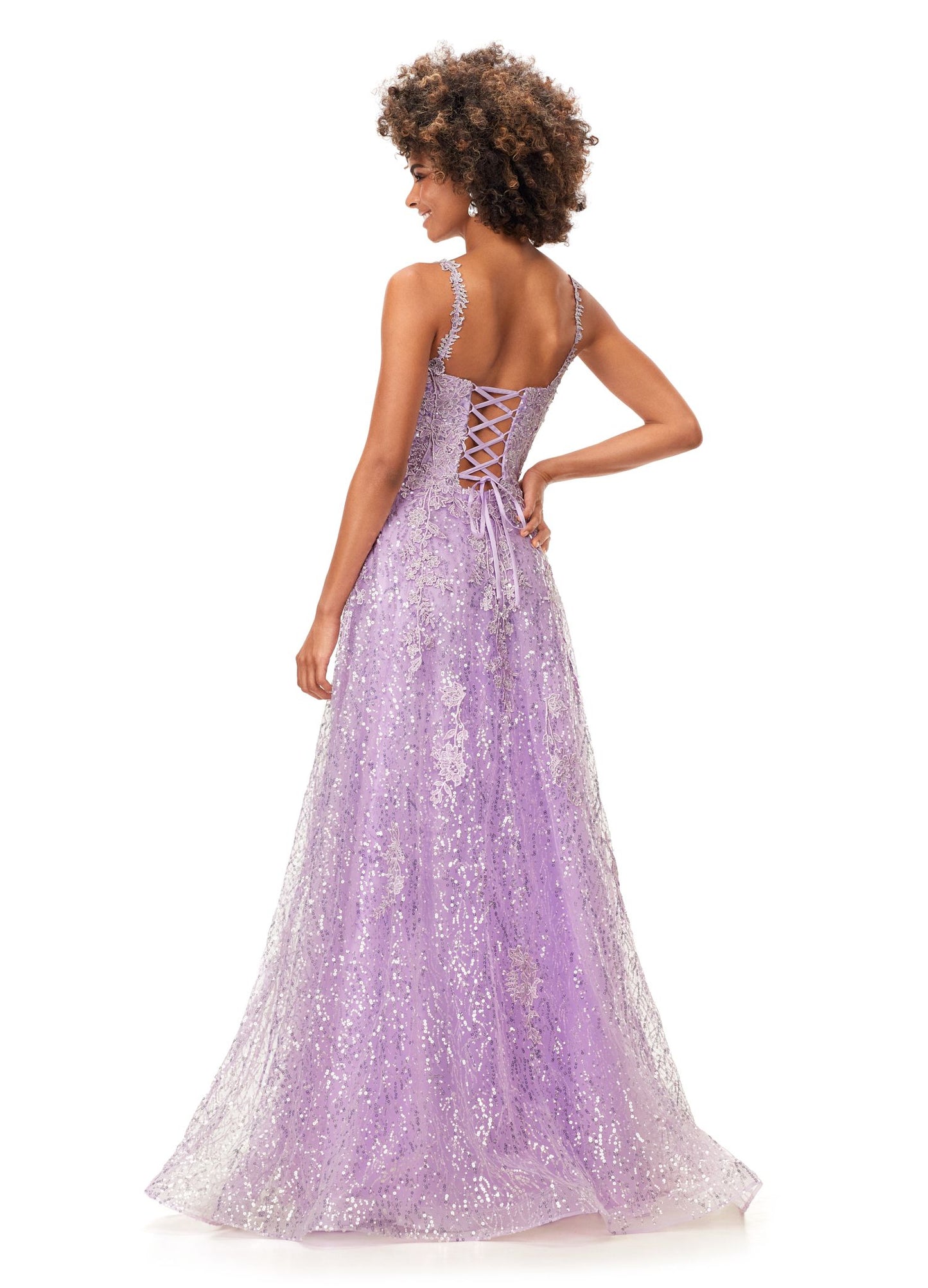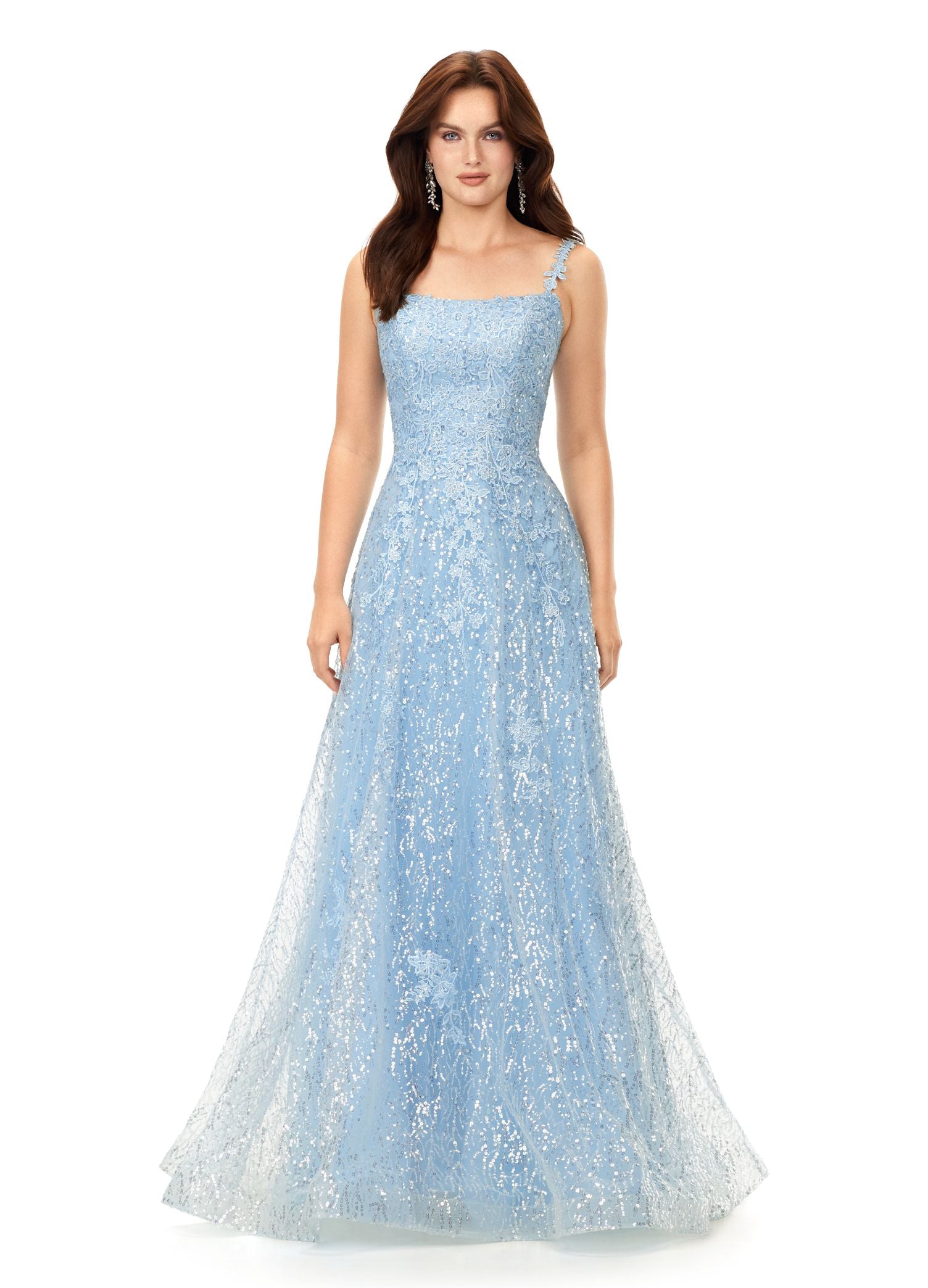 Ashley Lauren 11338 Feel like a princess in the gorgeous sequin gown with lace appliques. The straight across neckline is accented with lace applique straps. The applique continues onto the bustier and cascades down onto the a-line skirt. The look is complete with a lace up back.