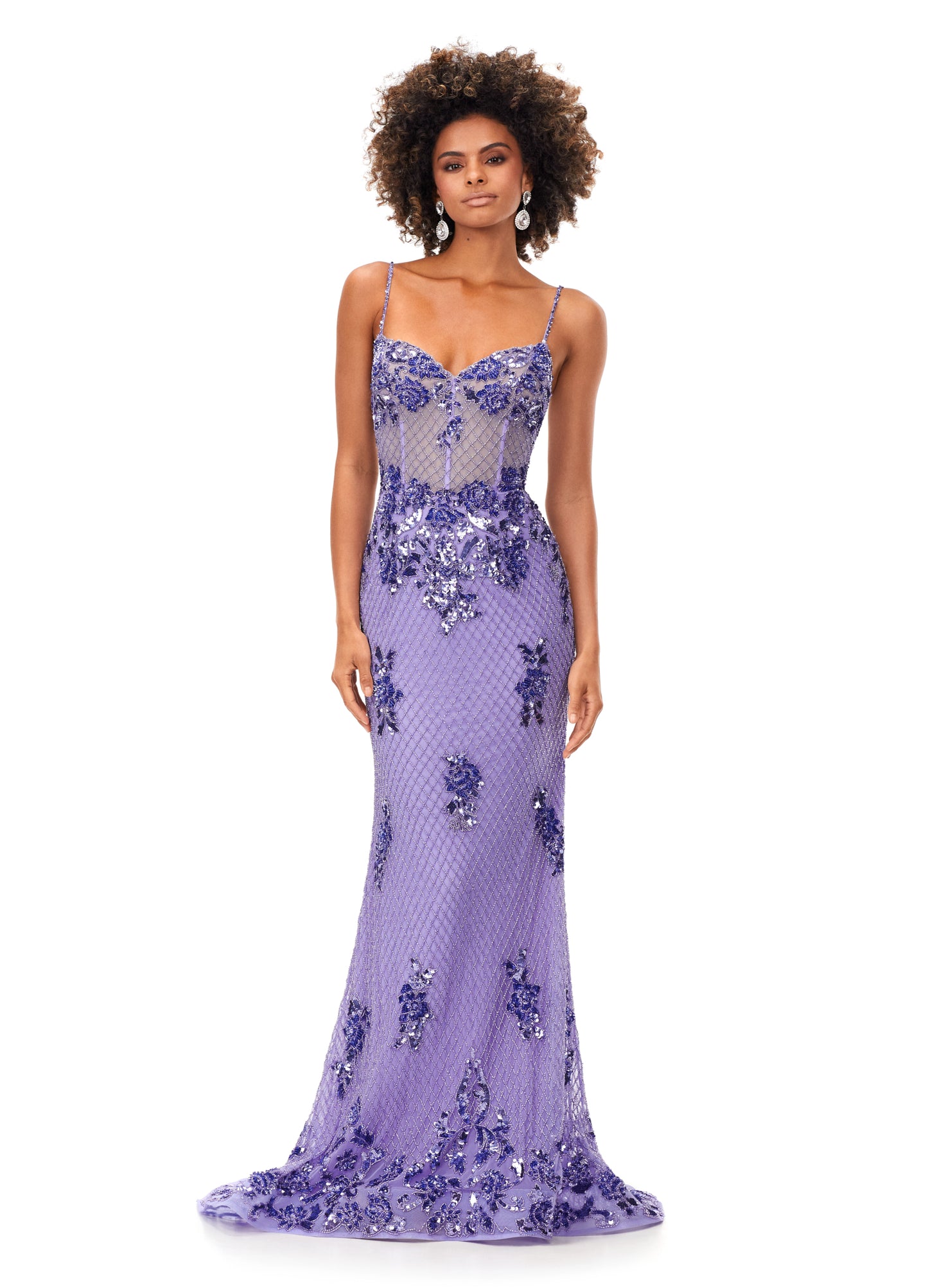 Ashley Lauren 11362 Fully Beaded with Sequins and Bugle Beads Prom Dress. This spaghetti strap gown features a sweetheart neckline giving way to a sheer illusion bustier. The bustier is embellished with intricate sequin details that cascade down onto the skirt and hemline. The look is complete with a sweep train.