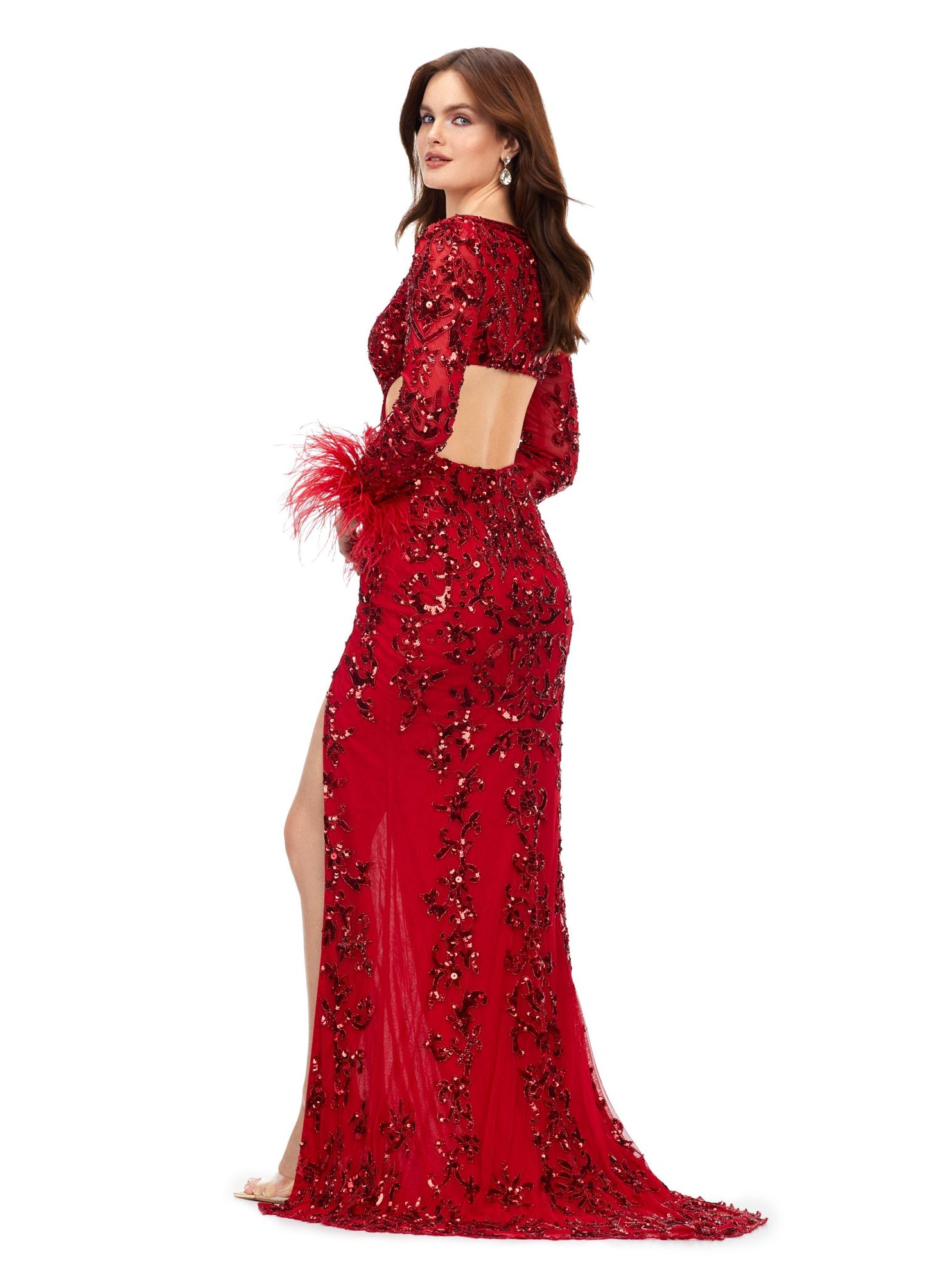 Ashley Lauren 11364 Talk about fabulous?! This beaded gown features a criss-cross cut out bodice and long sleeves. The sleeves are trimmed in feathers. The gown is complete with a left leg slit and sweep train.