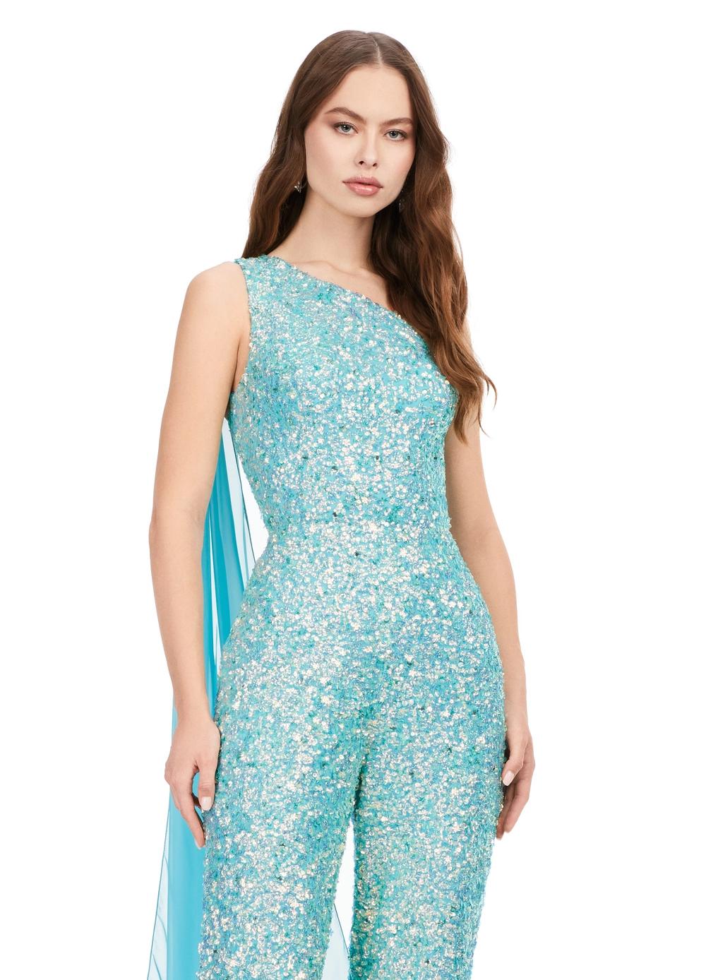 Ashley Lauren 11384 Fully Beaded With Removable Chiffon Cape One Shoulder Open Back Jumpsuit. Fall in love with this eye catching sequin jumpsuit! The one shoulder neckline is complete with a removable cape. The open back is adorned with sequin straps.