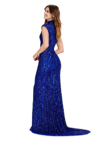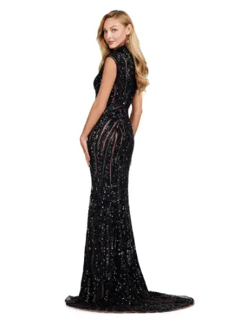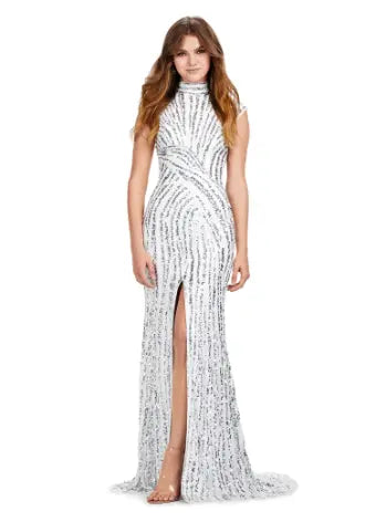 Make a statement in this Ashley Lauren 11395 long prom dress. With its fully beaded bodice and fitted silhouette, it is sure to turn heads. The high neck and center slit add a touch of elegance, making it the perfect choice for a formal event or pageant. This fully sequin dress has an intricate beaded motif that is sure to accentuate your curves. With its elegant high neckline and modest center slit, this dress will have you feeling like royalty!