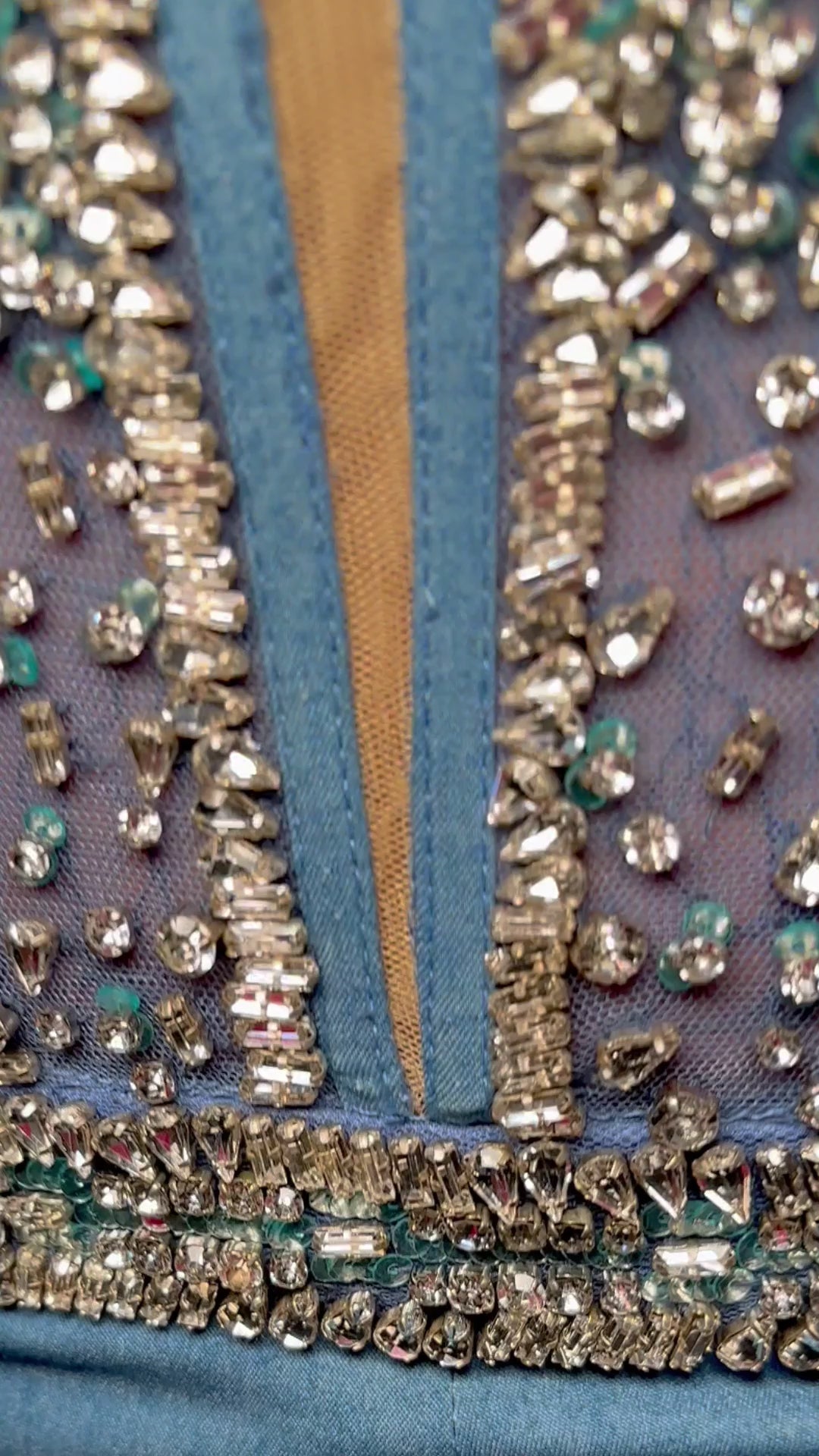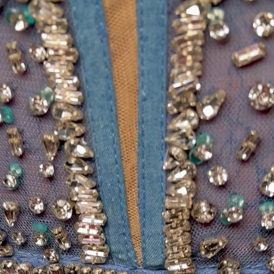 Ashley Lauren 11513 Denim Jumpsuit Beaded Bustier Corset Ombre Feather Formal Prom