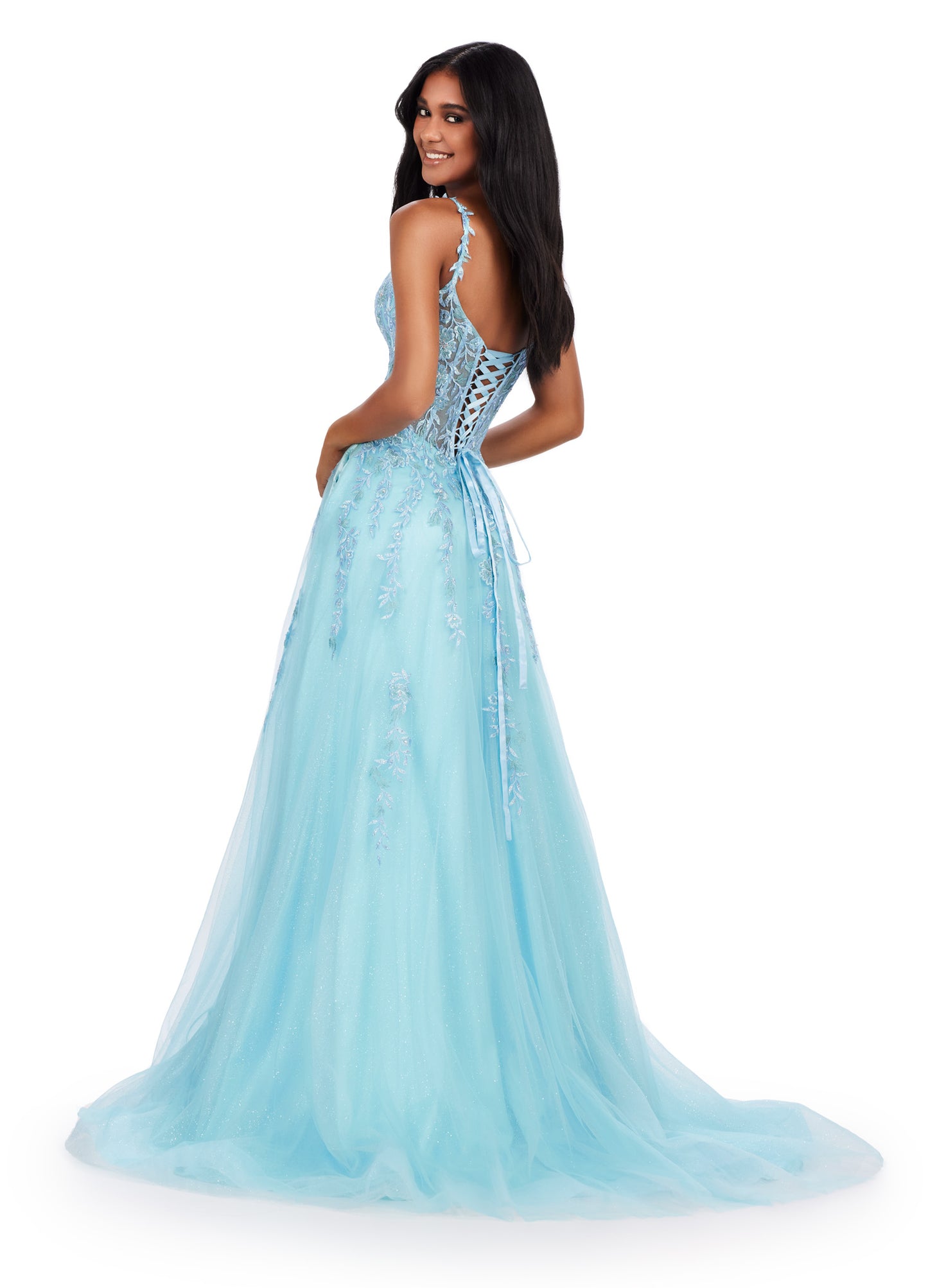 Ashley Lauren 11526 Long Prom Dress Corset Spaghetti Strap Gown V-Neckline Glitter Tulle Skirt Formal Pageant