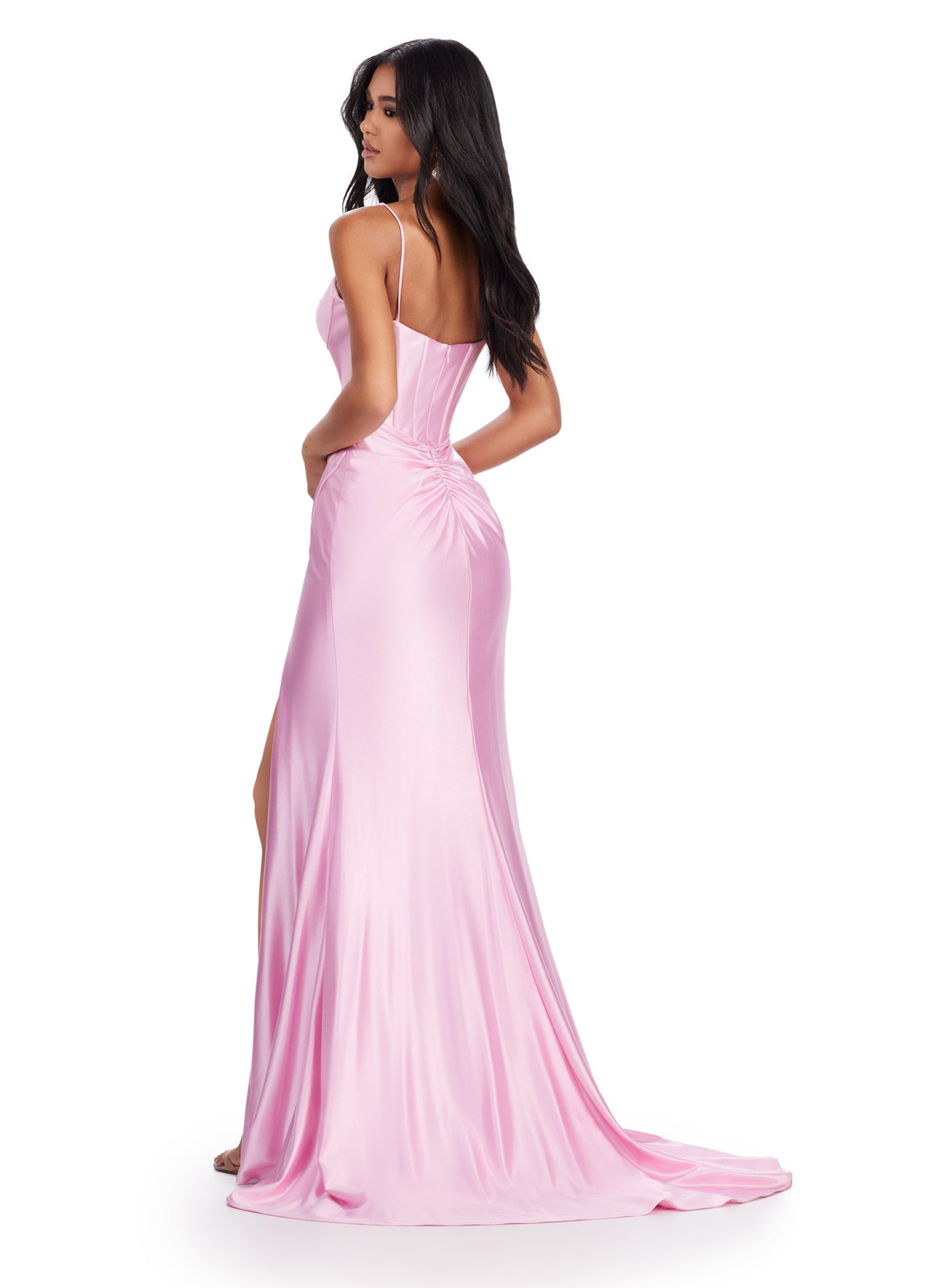 This formal Ashley Lauren 11549 prom dress features a flattering spaghetti strap corset bustier and a stylish slit. Perfect for pageants and formal events, this gown will make you feel confident and elegant. Red carpet ready! This jersey gown features a spaghetti strap design with a corset bustier and ruched skirt with a slit.